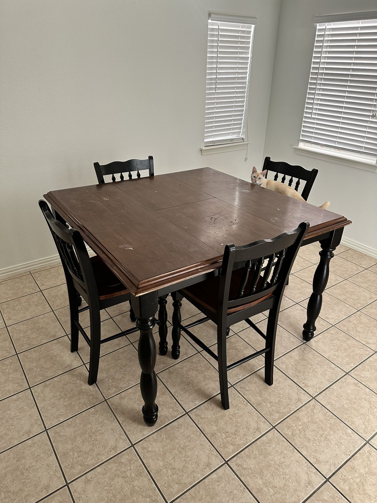 Extendable. 54” x 54” x 36” at full length. Chairs included. Cat not included lol Fully functional, with minor cosmetic damage on table top.