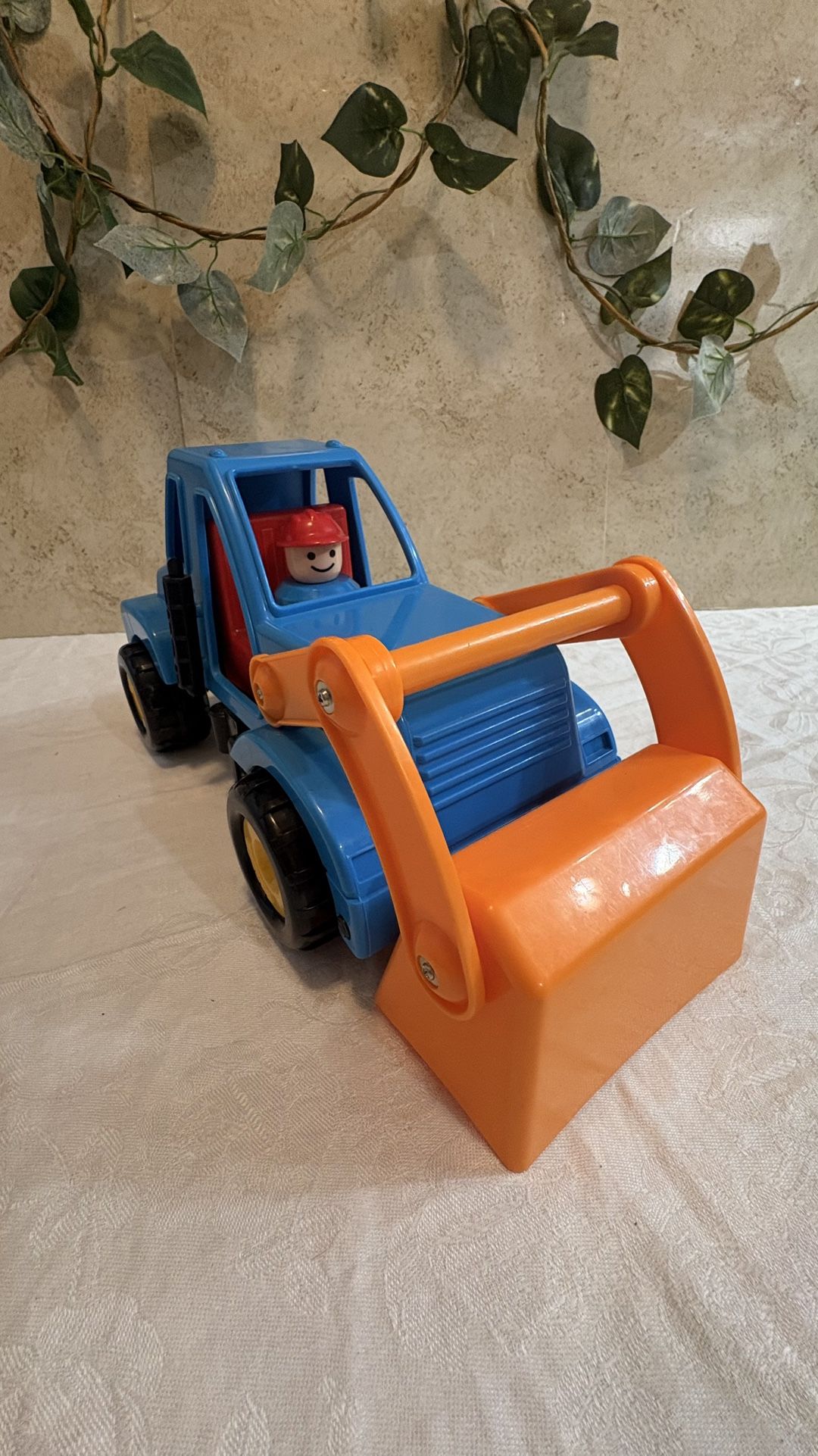 Front loader toy vehicle features a blue body, a large orange bucket, and a removable driver figure. Has soft, rubbery wheels suitable for both indoor and outdoor use. Movable Parts- The front shovel can be tilted and raised to transport materials. Measures 14” long by 6” high. Cash or Venmo accepted.