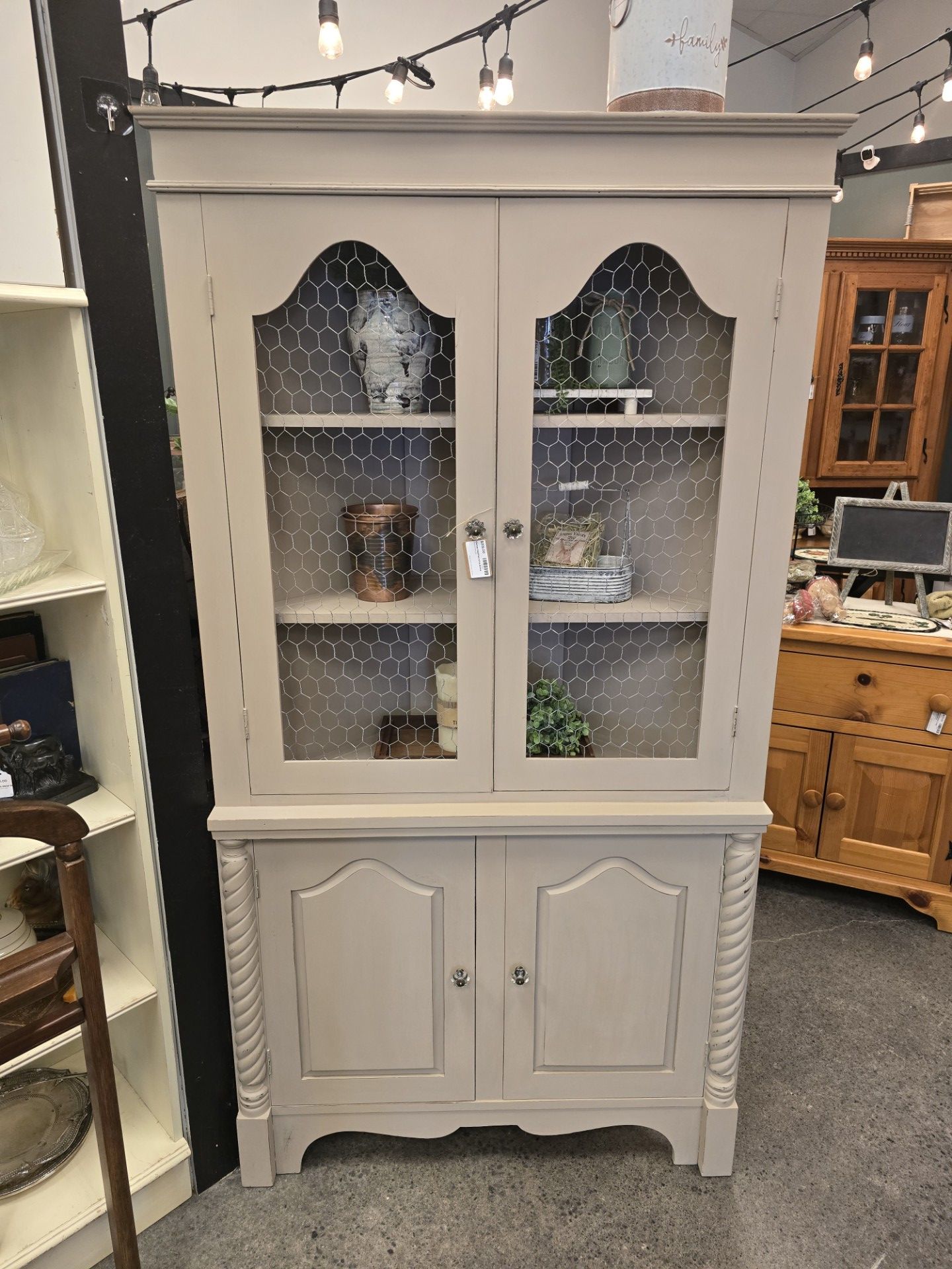 Charming neutral-toned cabinet featuring chicken wire doors, adjustable shelving, and classic turned details. Perfect for displaying dishes, décor, or using as extra storage in a dining room, kitchen, or entryway. Solid, sturdy piece with lots of character and a soft, versatile finish that works with many styles. Great one of a kind statement piece Available in Buckley @ Waymans Vintage Market $315+tax Side measure roughly 26" deep along the wall. 36" across the front 70" tall Behind wire doors Bottom height shelf 11-1/4" tall Middle 11-3/8" tall Top is 11.5" tall at opening, inside height is 14.5"