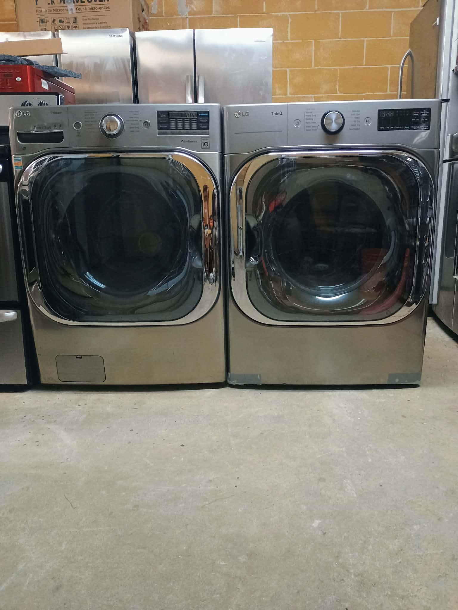 Clean LG washer and dryer set. Both silver front load machines. Washer has Direct Drive and Steam features. Dryer has ThinQ tech. Great for your laundry room. Delivery and installation included !!