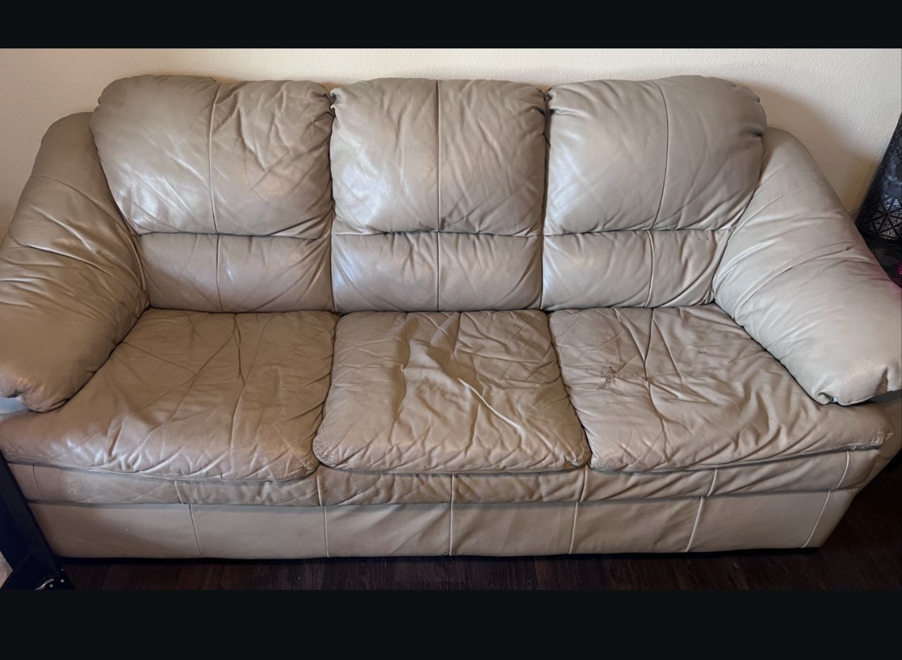 Used tan leather 3-seater couch in fair condition. Still super comfortable and sturdy. Has visible wear, creasing, and a small tear on one seat (shown in photo), but nothing that affects how it sits. Great for a starter apartment, game room, or man cave. PRICE NEGOTIABLE!