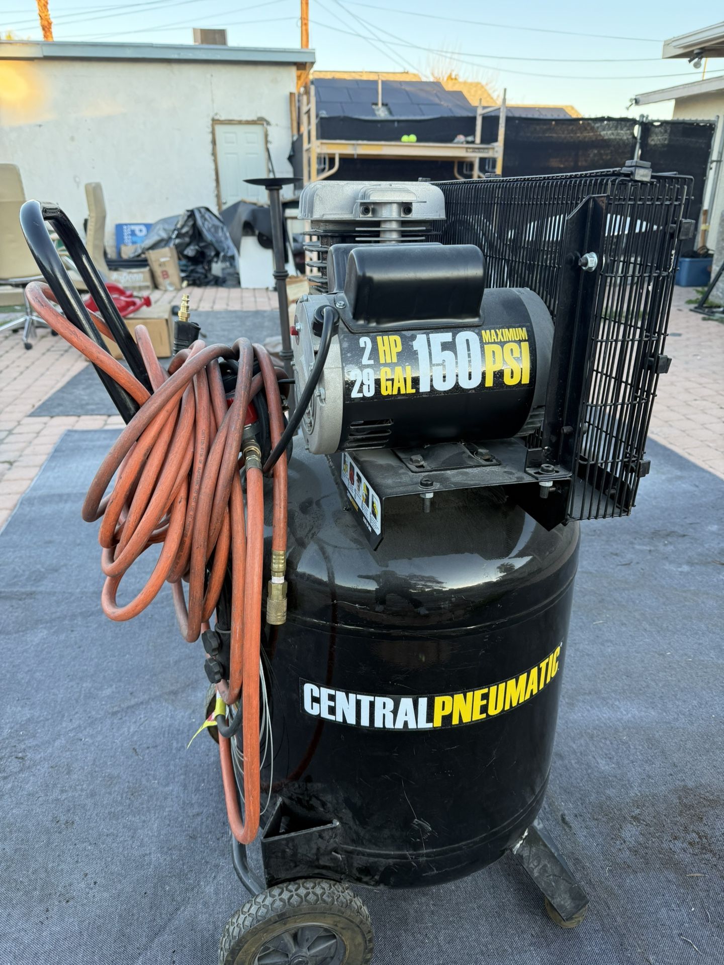 Works good! The 29 gallon tank on this air compressor gives the boost you need to properly operate your pneumatic tools. This air compressor’s 2 HP motor allows up to 150 PSI of air. Features include a conveniently placed handle, smooth rolling wheels and a fully shrouded pump and motor for protection. Air delivery: 5.9 CFM @ 90 PSI, 7.3 CFM @ 40 PSI Twin capacitor motor for easy start up Adjustable handle and semi-pneumatic wheels for easy maneuvering Oil lubricated pump for reliable performance Thermal overload protection Dual pressure gauges and built-in quick coupler Location; E. Lake Mead Blvd Las Vegas, Nevada