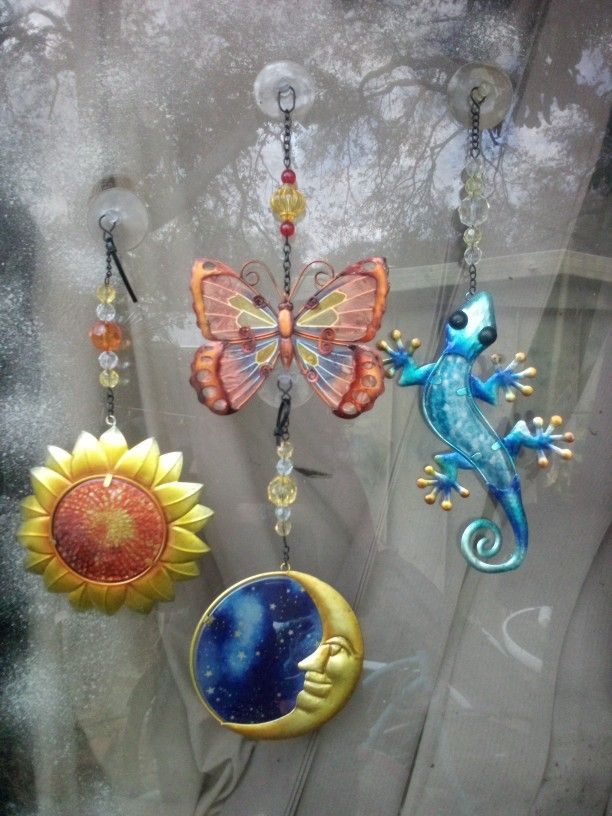 Butterfly,moon,lizard,and sunflower window hangers. They each have a suction cup that sticks to the window.