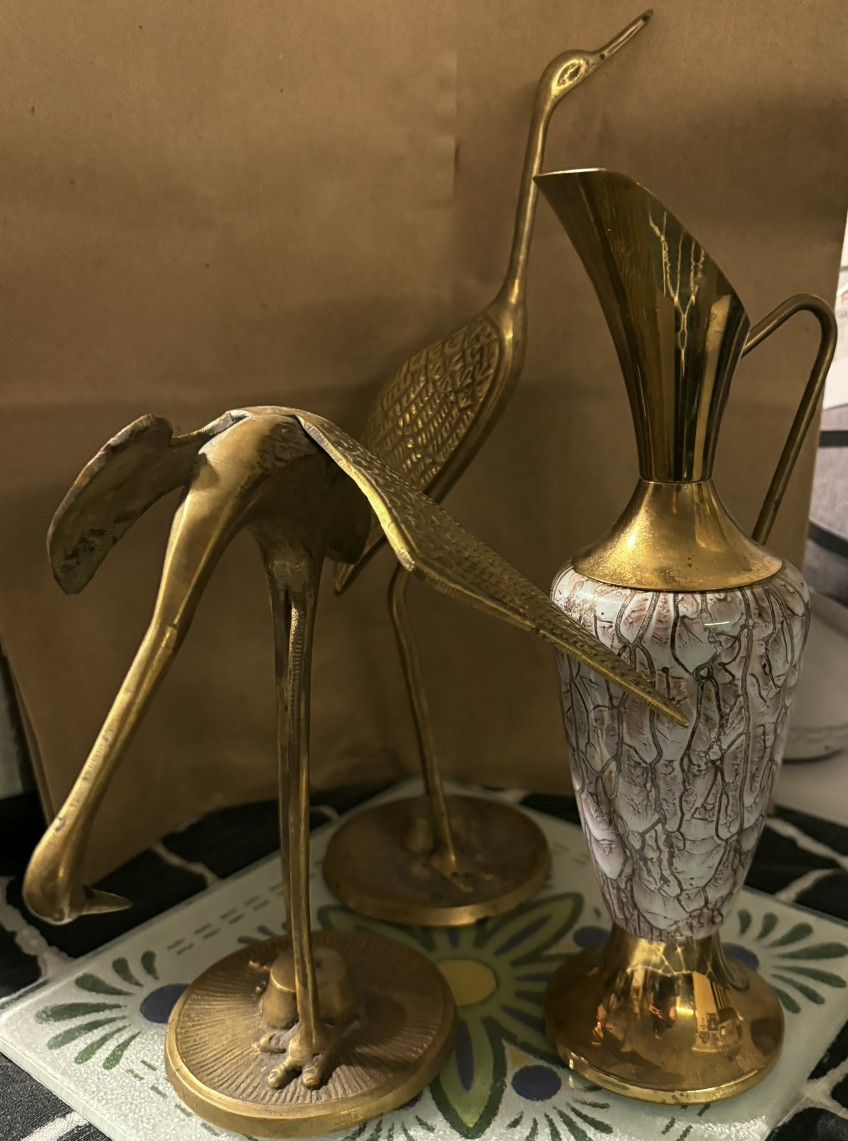 This vintage Delft Holland vase is a stunning piece that will add character to any space. The ceramic and brass material combination gives it a unique and elegant look. The marbled pattern and hand painted copper color make it a one-of-a-kind antique piece. This small pitcher vase has a printed backstamp and was produced using pottery techniques in the Netherlands in the 1950s. It is an original Delft brand item that will add a touch of vintage charm to any decor. This vase is perfect for displaying flowers or as a standalone decorative piece. 2 Vintage Solid Brass Cranes Heron Egret Figurines 8” Tall & 5” Tall X 3" Across Mid Century Statues Bases 2 1/4".tags...vintages...collectables...denon..pioneer..sony..kenwood..tower speaker..infinity speakers..jbl..Polk audio...marantz...toys..vinly..turntable..toy bundle "Star Wars collectibles", "Vintage toys",