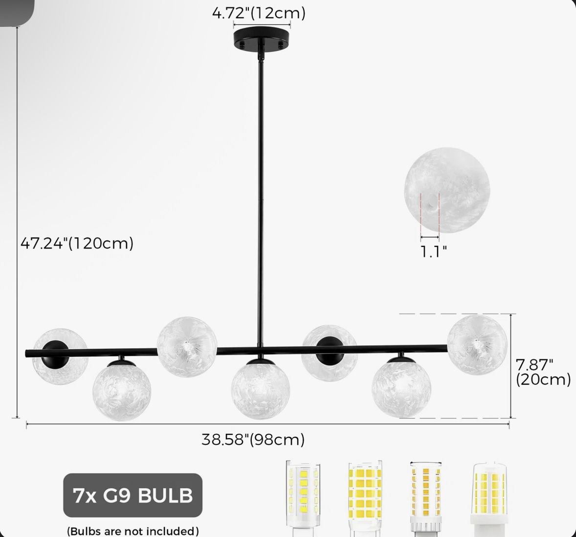 This mid-century modern chandelier for dining room adopts a linear metal frame and 7 glass globe lampshade. The frame design is simple yet sophisticated, suitable for a wide range of interiors from mid-century modern to contemporary styles.This globe pendant light is a versatile addition to any space, suitable for both residential and commercial settings. Ideal for dining rooms, kitchens, living rooms, bedrooms, and even office spaces. Its elegant design and adjustable height make it a versatile lighting solution that complements any room. Features Unlike others this chandelier Light Fixture comes with a stem can be tilted up to 180°, available for both Sloped, Slanted, Vaulted and Flat Ceiling. This modern black chandelier is equipped with 4 pendant rods: 4 x 9.8""(25cm), which can be connected or not as needed. G9 x 7 bulbs, max 7W each bulb(bulbs not included), we recommend LED bulbs. Fully dimmable when used with dimmable bulbs and a compatible switch (switch not included). Whether you prefer a warm, cozy ambiance or bright, light, this bubble chandelier provides the flexibility you need. This high ceiling chandelier included instructions to aid in your installation process. This makes the process easy, taking away the stress and hassle of complicated installation methods. Other Dimensions Body Dimensions 7.87'' H X 5'' D Canopy 0.98'' H X 4.72'' W Shade 4.72'' H X 4.72'' W X 4.72'' D Overall Product Weight 7 lb. Overall Maximum Height 47.24'' H Downrod Size(s) 4 x 9.8" Details Fixture Design Shaded, Chandelier Canopy Included Yes Light Fixture Shape Linear, Shaded / Spider Number of Lights 7 Adjustable Length Yes Number of Light Tiers 1 Light Direction Ambient Fixture Material Metal Sloped Ceiling Compatible Yes Integrated LED No Bulb Not Included But Required Yes Bulb Base G9/Bi-pin Dimmable Yes Voltage 110 Volt Maximum Wattage (Per Bulb) 10 Watt Power Source Hardwired Imported Yes Dry, Damp or Wet Location Rated Dry What is Dry, Damp or Wet Location Rated? This indicates whether the fixture is safe to use in dry locations, damp locations (moist environments), or wet locations (direct exposure to water). Pieces Included Shade, Downrod Recommended Bulb Shape Tube Recommended Bulb Shape Code G9 Shade Material Glass Shade Color Snowy White Assembly Assembly Required Yes Mounting / Installation Required Yes