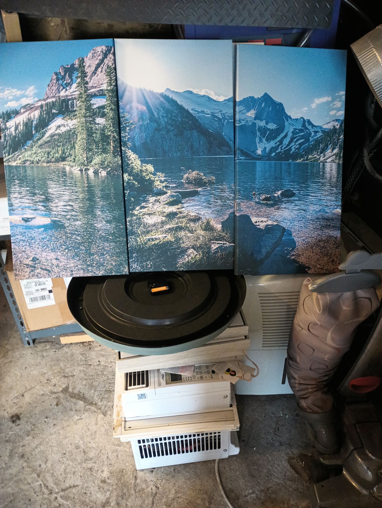 3 PIECE PAINTING OF LAKE MOUNTAIN SCENERY. SIZE 3FEET X 25 INCHES.