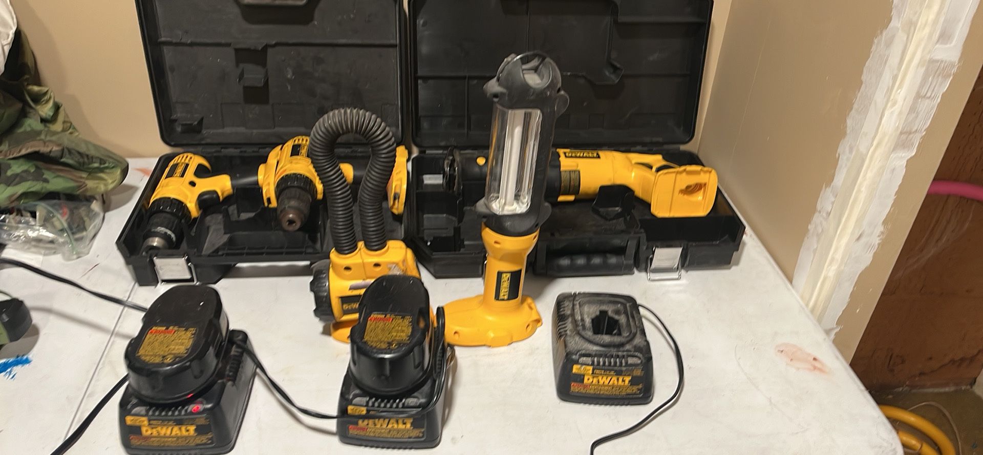 2 drills Reciprocating saw dc385 2 work lights 2 batteries (both lost some charge) dc9098 3 chargers