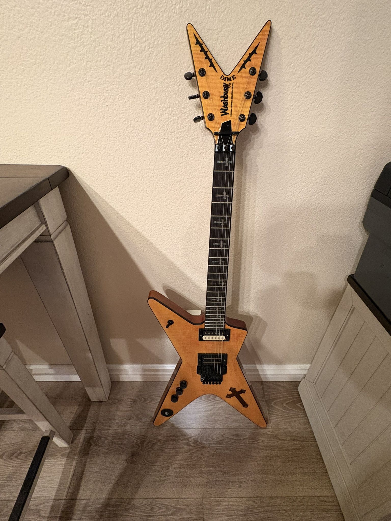 This is a Chinese counterfeit Washburn dime guitar. Has some paint dripping on the one side.
