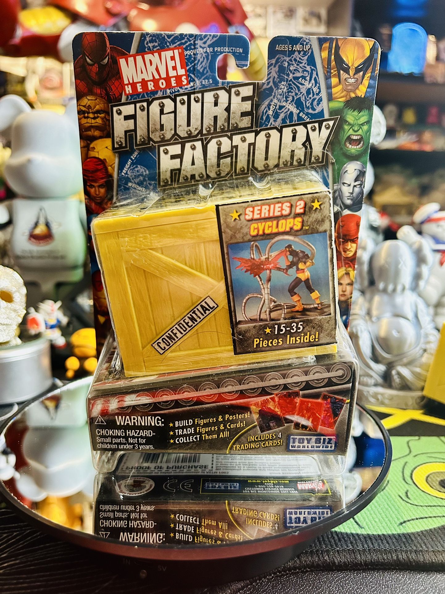 Released in 2005, every package contains a pretty cool looking shipping crate, measuring 3 1/2″ wide and is 2 1/2″ tall, with 15-25 pieces to build a 3″ figure from the Marvel Universe. The crates are detailed nicely with a faux wood grain, painted with Marvel Heroes, Figure Factory, Confidential and a hint of what’s inside logos. Take off the removable lid and the figure pieces along with instructions are bagged inside. Each series contains identified figures and twelve (12) mystery figures (see below for mystery codes). Each package also contains four (4) randomly packed double-sided trading cards. Collect all the cards to create two different 20″ x 28″ posters. One side will feature various Marvel characters.