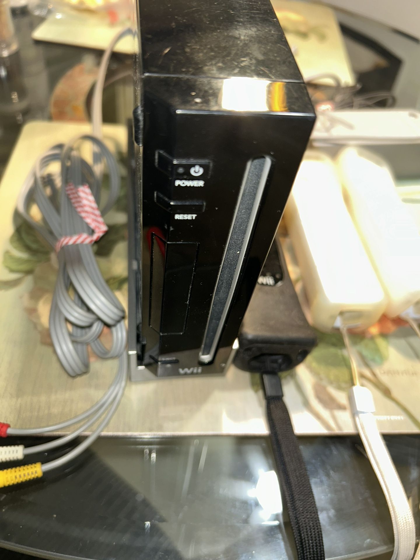 Nintendo Wii bundle includes console with stand, 3 controllers, sensor, power cord, and game cable.