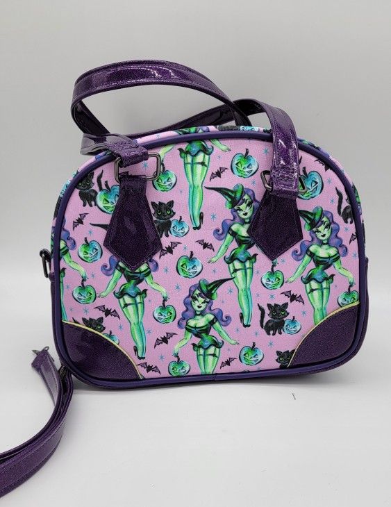 Custom hand crafted vintage Halloween pin-up witch purse.. this bag is a bowler style bag measures 12x10x5. Has strap handles and cross body both. Bag is brand new. Made in a smoke and pet free shop.
