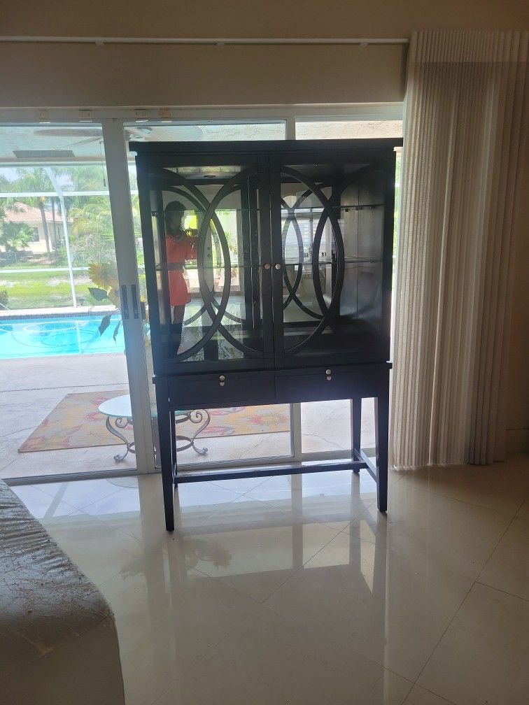 Dark brown wood armoire. Can be used for China. I used it for wines. Mirrored backing, lights up inside. 2 glass shelves. 2 small draws.
