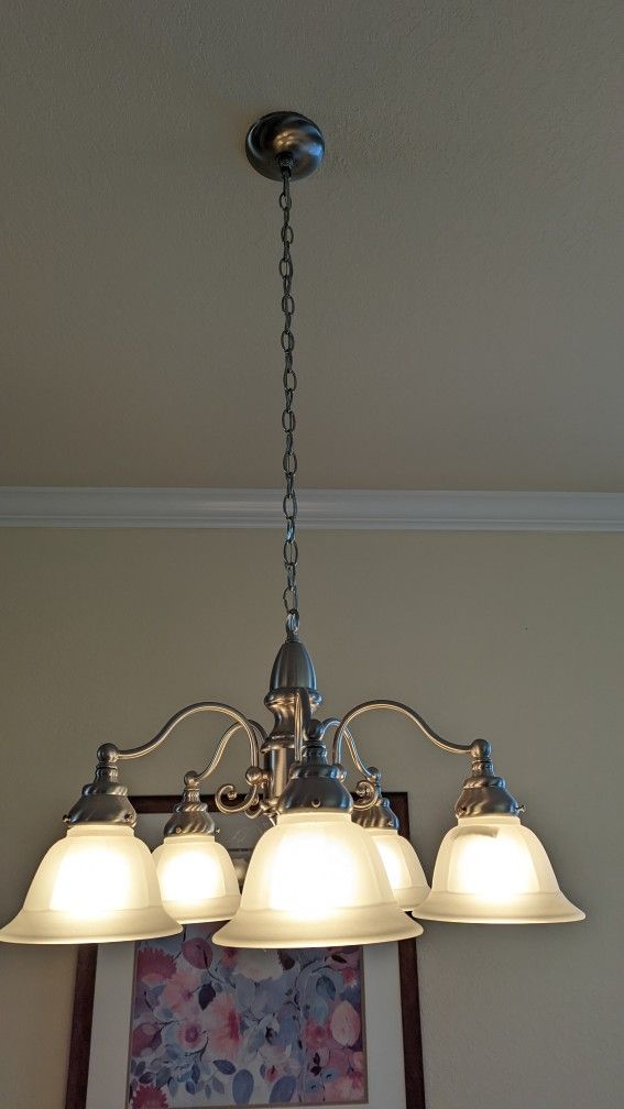 (2) brushed nickel 5. Light chandelier all the glass is intact and good working order. We replaced with other lights and do not want to throw them away $7.50 each