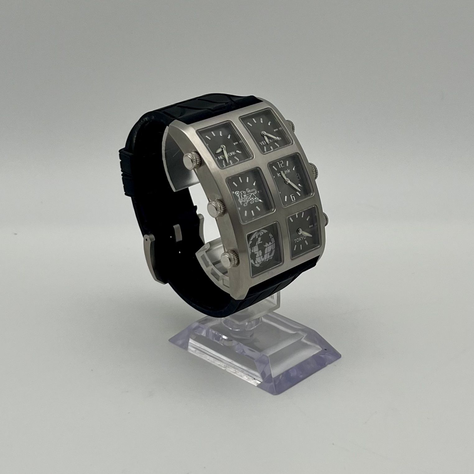Excellent working condition, minimal signs of use. The Generation 6TZ stainless steel watch features a unique design with six time zones (including NY, Yerevan, Tokyo, LA) grey dial with silver indexes, brushed satin finish and rubber strap. One of a kind piece! Retails for ~$1000+. To purchase, visit us at: Glendale Cash Pawn Shop 1245 E. Colorado St. Glendale, CA 91205