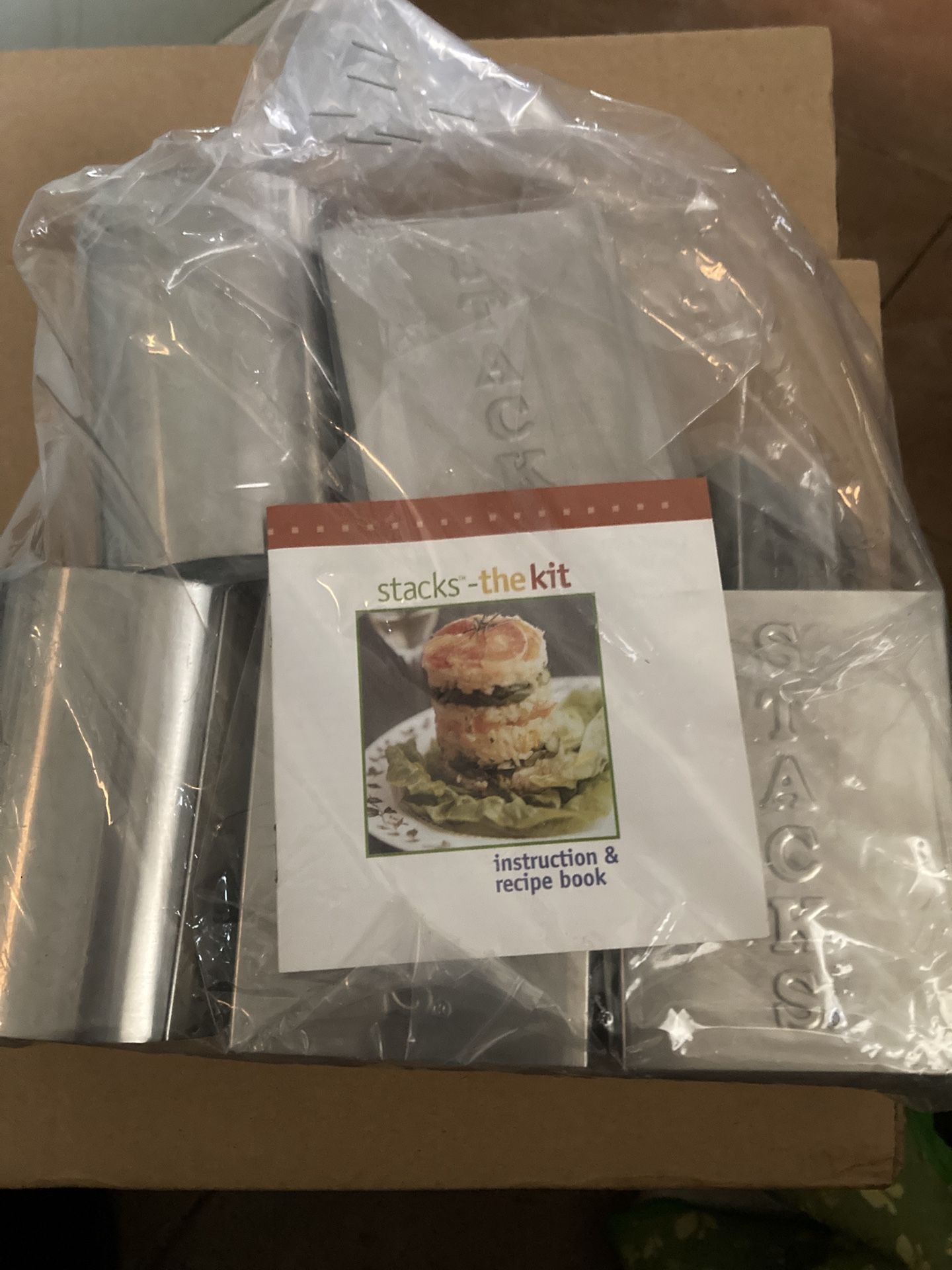 Vintage 1990’s “Stacks-the Kit", a collection of food preparation tools used for vertical food presentation. The kit is designed to help create stacked sandwiches or other dishes in appealing shapes (square, circle, triangle) and typically includes stainless steel cutters,
