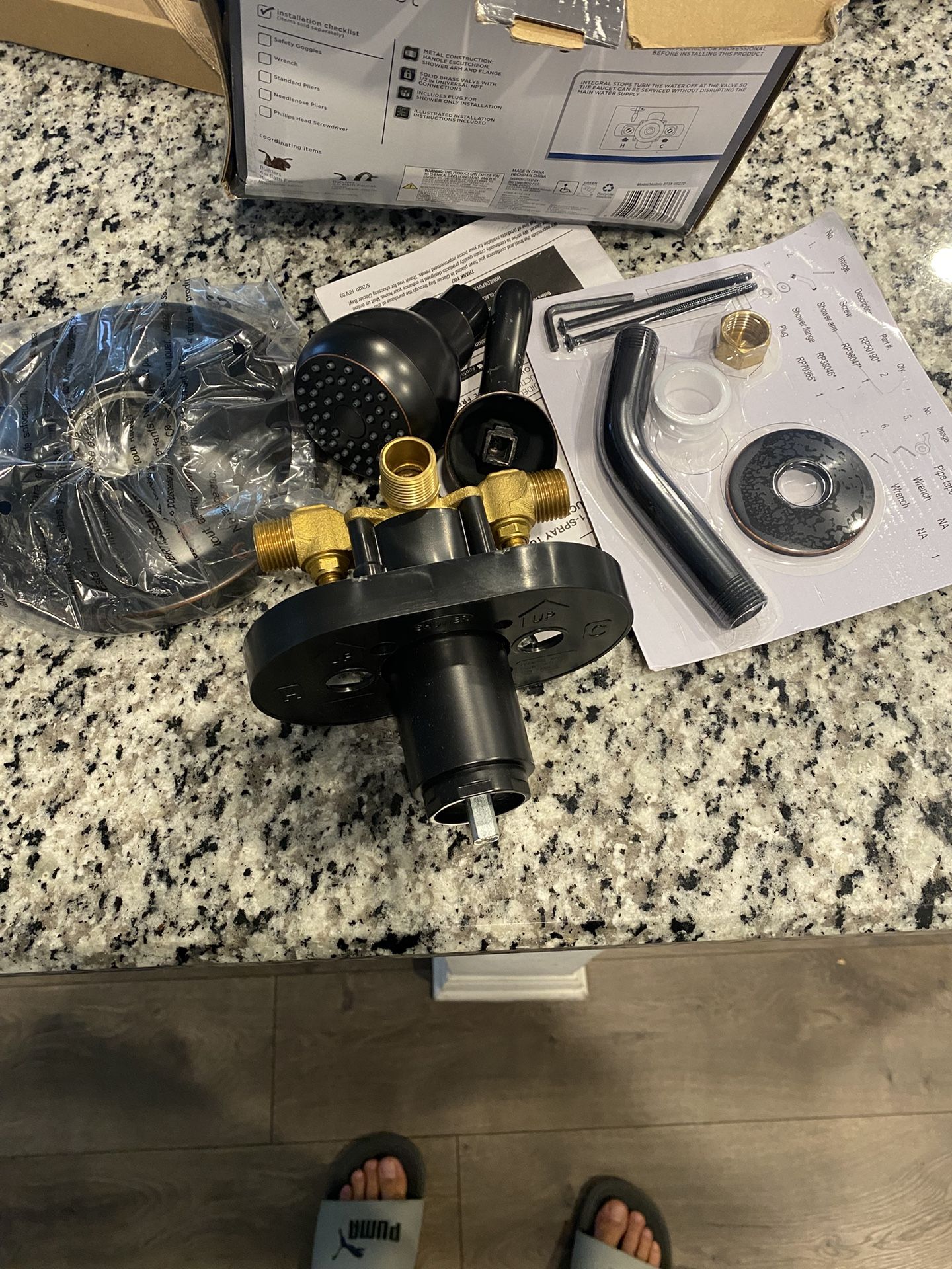 New Glacier Bay tub and shower faucet set. Color: Oil Rubbed Bronze. Condition: New, box opened to check contents. Comes with valve, showerhead, handle, tub spout, and installation hardware.