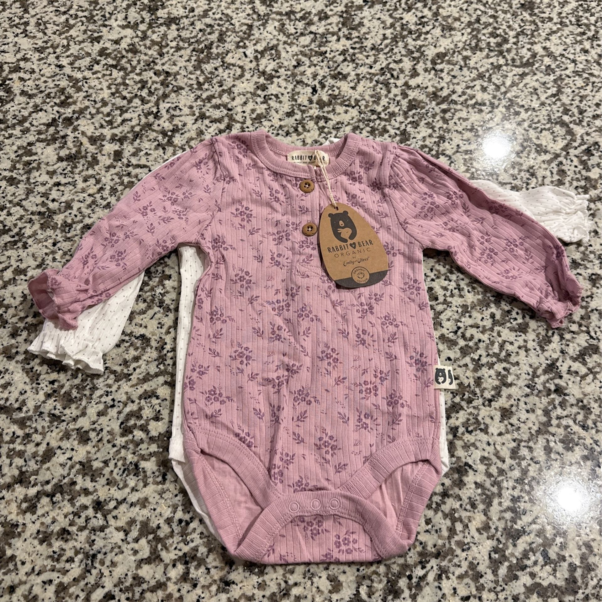 Set of 2 baby onesies. Rabbit Bear organic cotton. Size 6-9 months. One purple with flower print. One white white purple dots. Lettuce edge sleeves. Brand new with tags. Smoke free home.