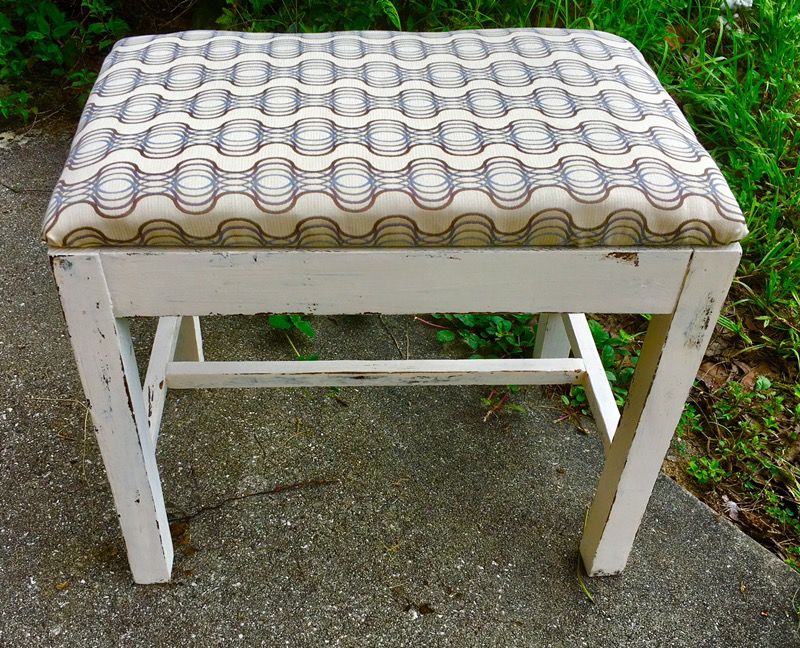 Distressed stool, has new upholstery, cream colored with a hint of blue and brown in the design. Measures, 21"L x 18"H x 14"W