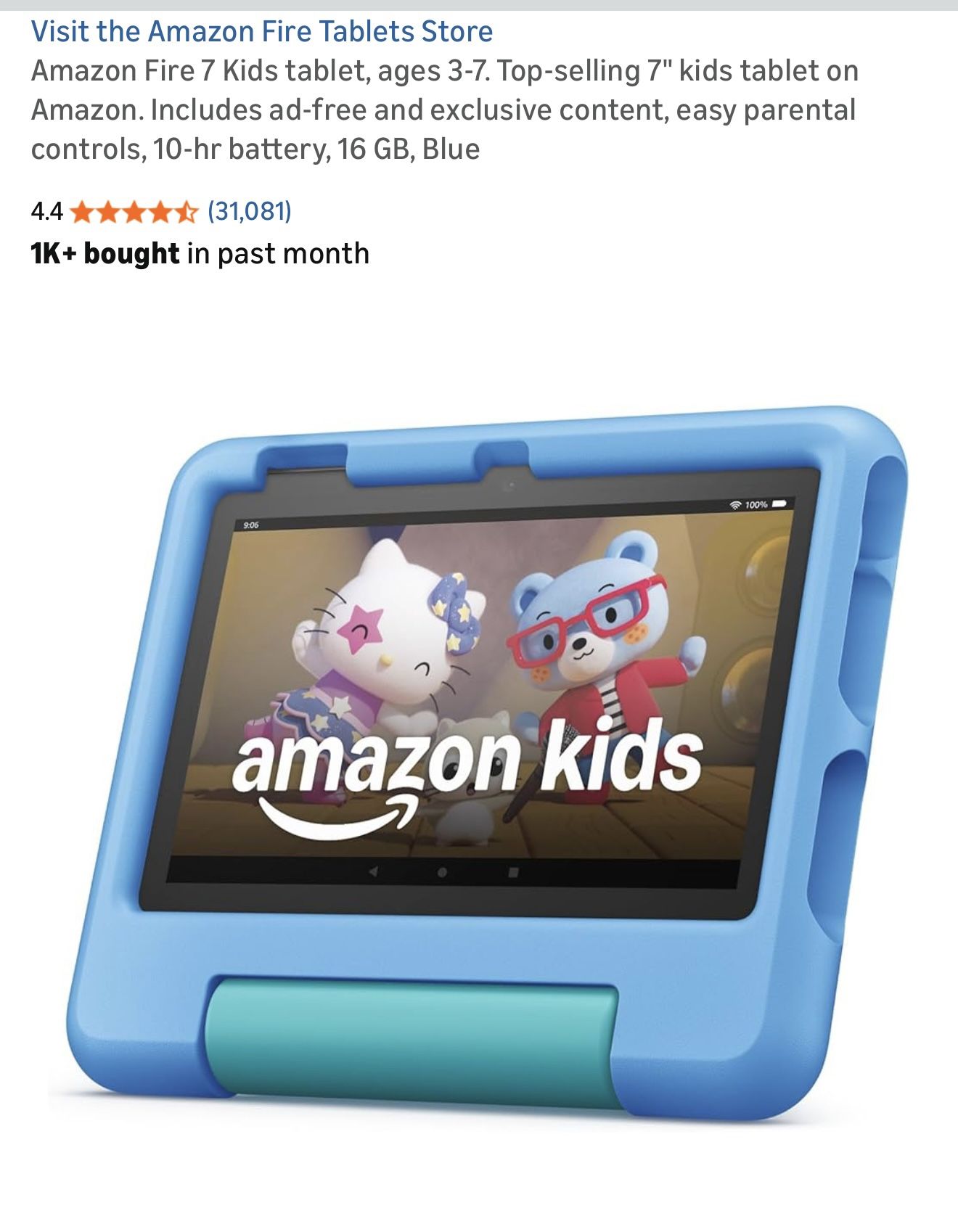 Amazon Fire 7 Kids tablet, ages 3-7. Top-selling 7" kids tablet on Amazon. Includes ad-free and exclusive content, easy parental controls, 10-hr batte