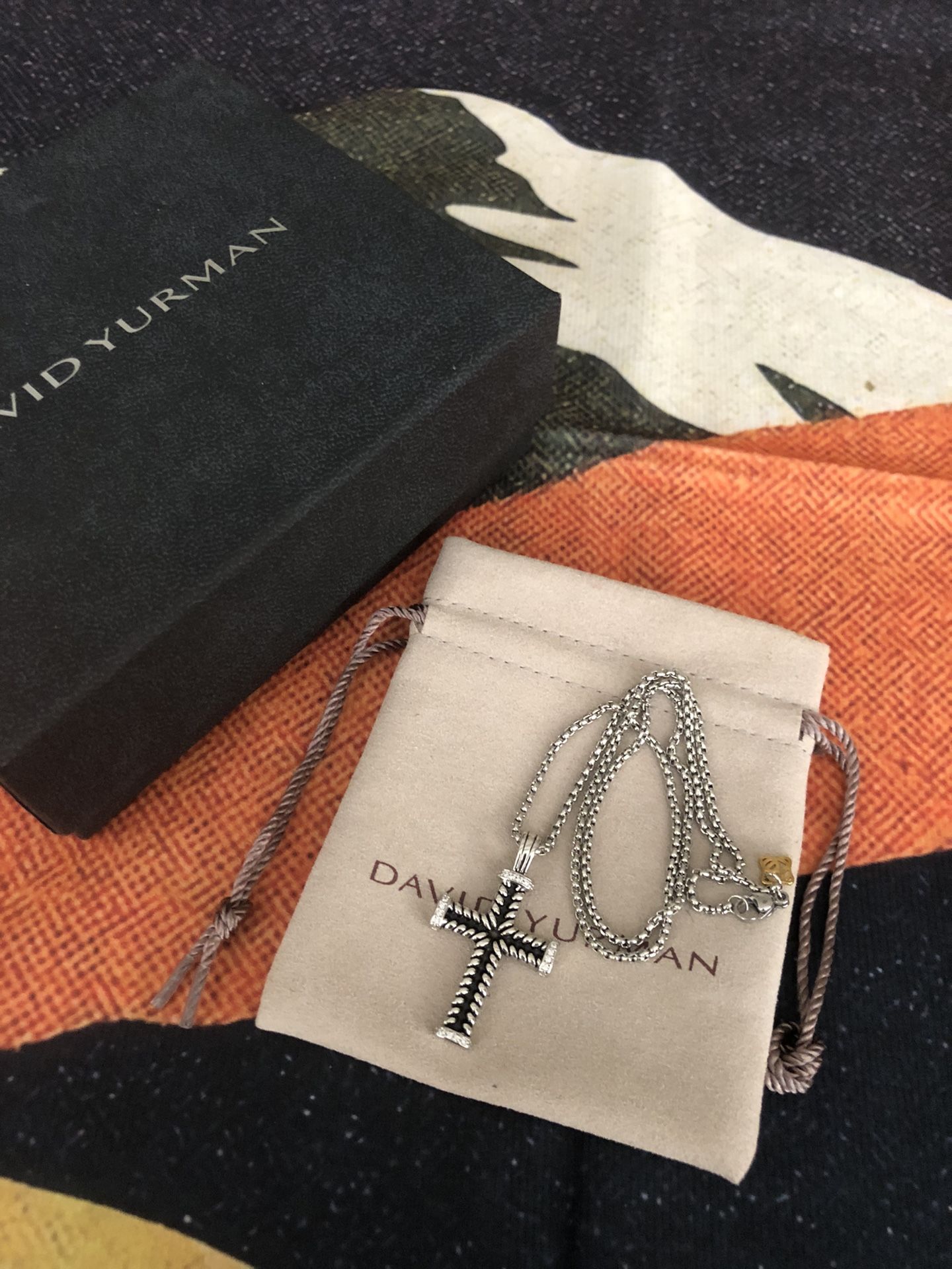 For sale: A brand-new, never-worn 21-inch David Yurman cross necklace. Returns are supported if you are not satisfied. Comes with a dust bag and gift box. Feel free to contact me if you like it, and I can mail it to you.