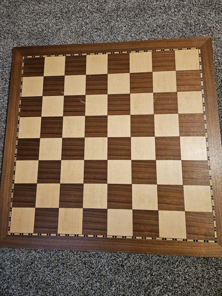 Inlay wood cherry and maple 27"x27" board size. Pieces have storage container. Small scratch on board but beautiful quality.