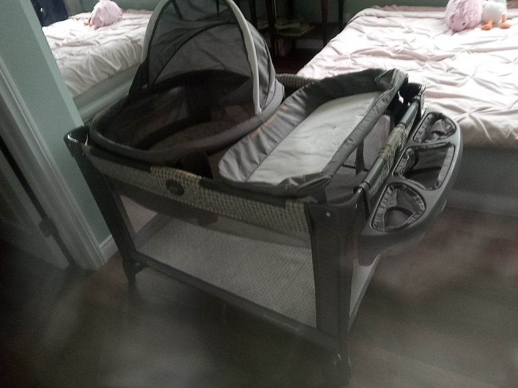 Used twice for granddaughter. It's in excellent condition very easy to put together. It's has the playpen, bassinet and changing table all in one.