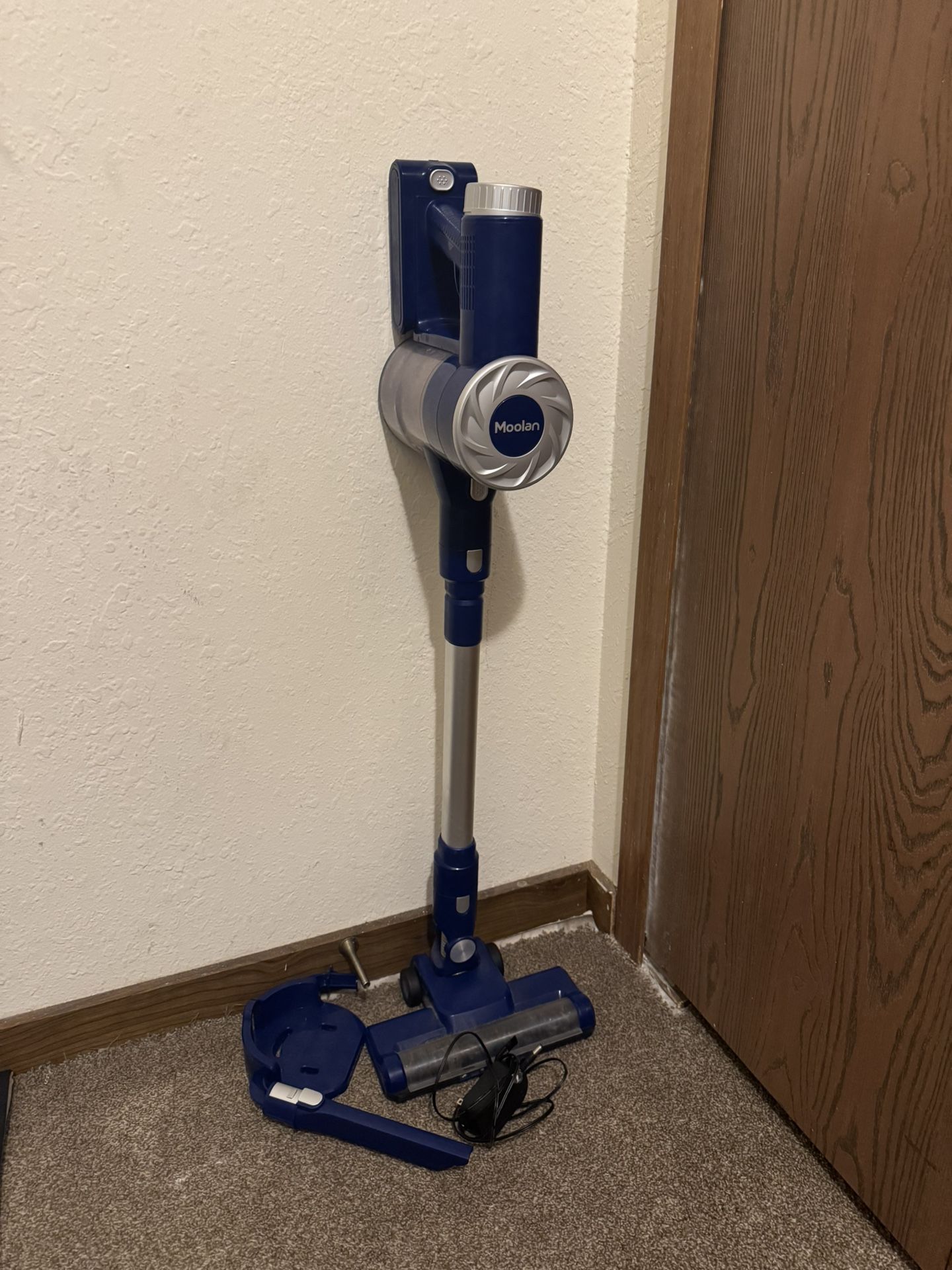 Blue Moolan cordless vacuum cleaner with accessories.