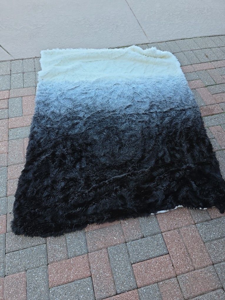 Three tone fur blanket has white gray and black coloring with a soft backside fabric