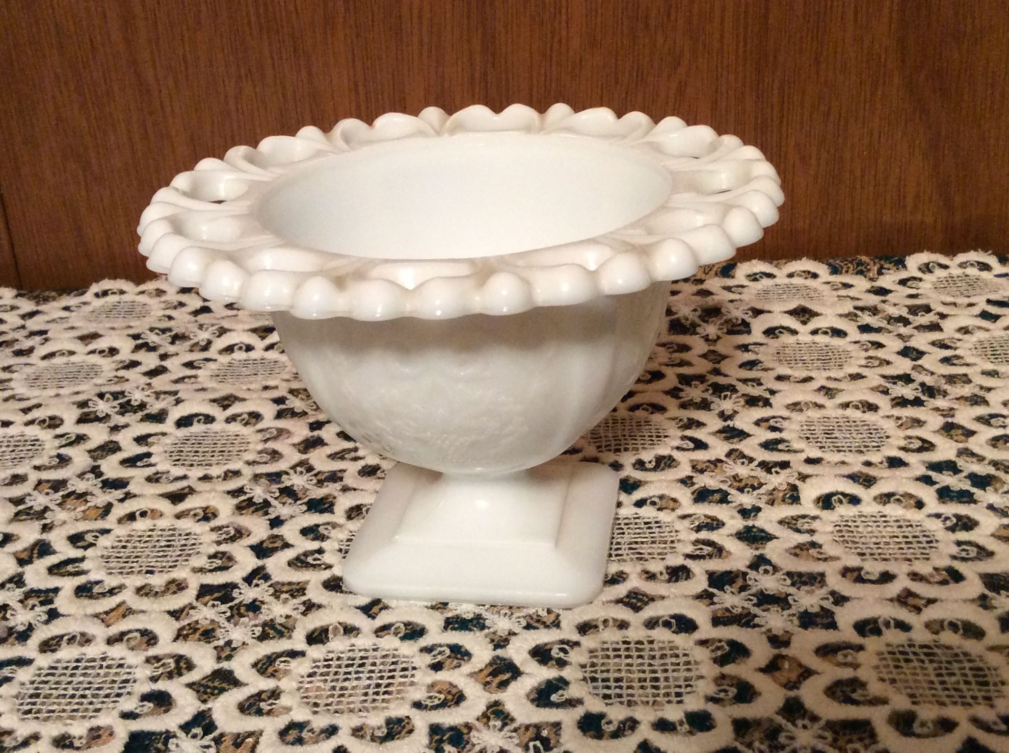 Vintage Lorain Basket Milk Glass Footed Compote - Candy Dish With Lacy Open Edge