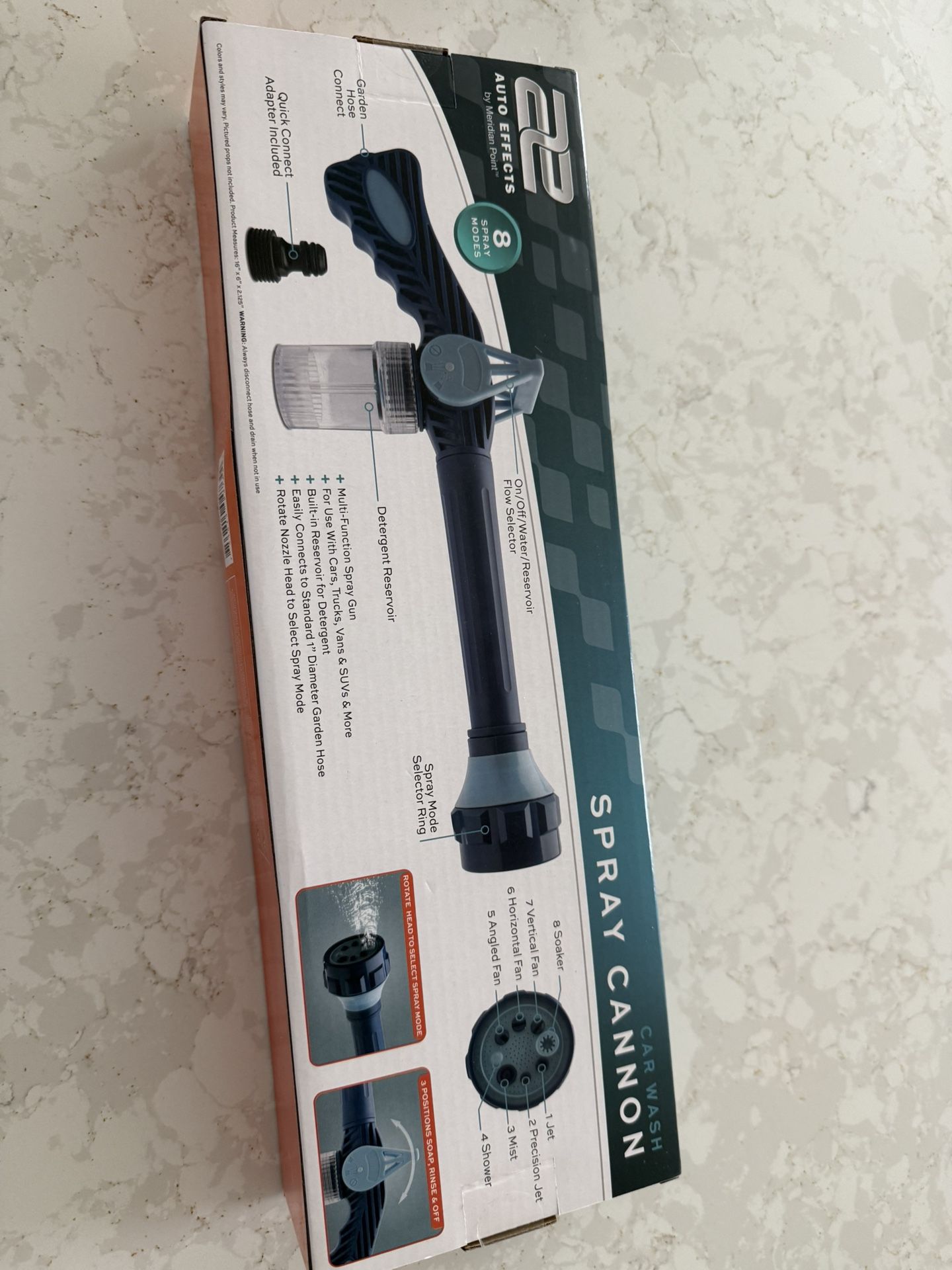 Muti function spray gun for use on cars, trucks, & more. Built reserve for soap, easy connects to hose and rotate to select spray nozzle.