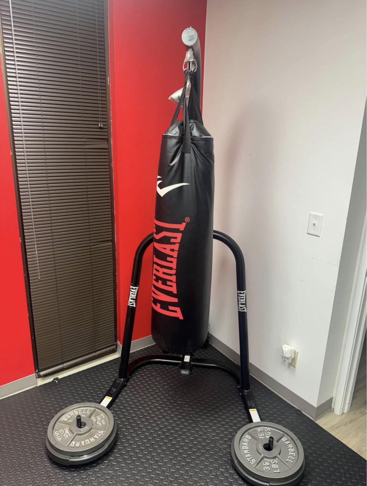 Everlast heavy bag with stand and weight plates included. Full set up no mounting needed. Great for boxing, cardio, or home gym. Good condition and ready to use. Pick up only