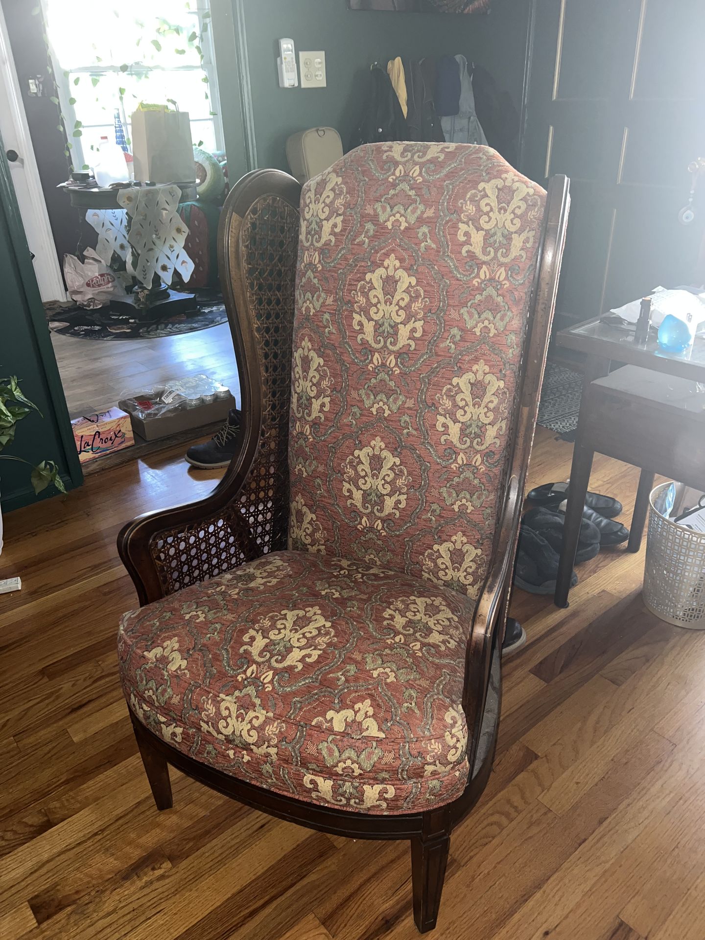 Has a crack in the left arm and one piece of the caning is loose as pictured above. Could use some TLC. The overall structure of the chair is solid and the seat of very comfortable.