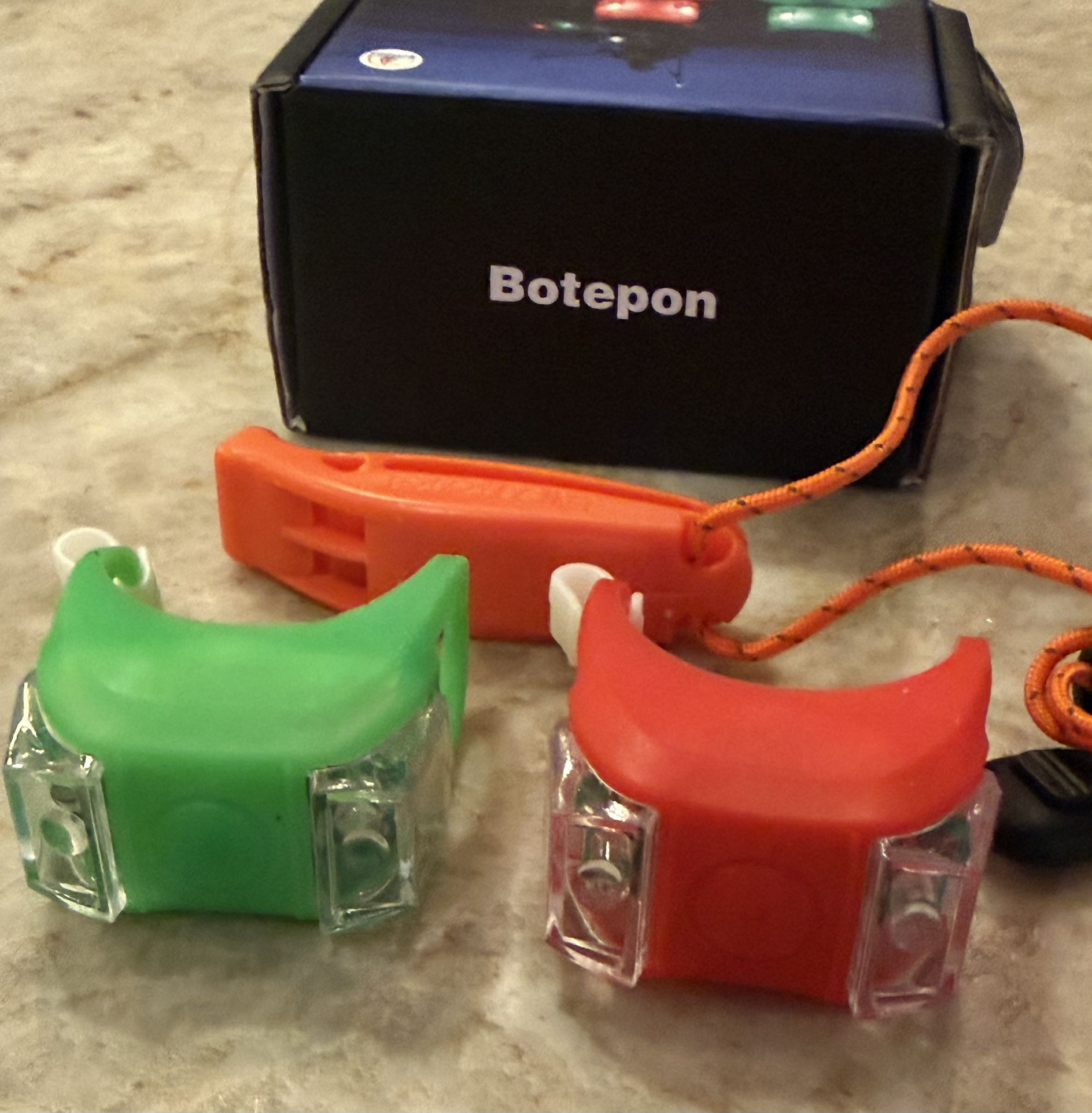 Brand new Botepon red/green LED bow lights - perfect for kayaks, canoes, jon boats, and night‑time navigation. Comes with an emergency safety whistle and extra CR2032 batteries.