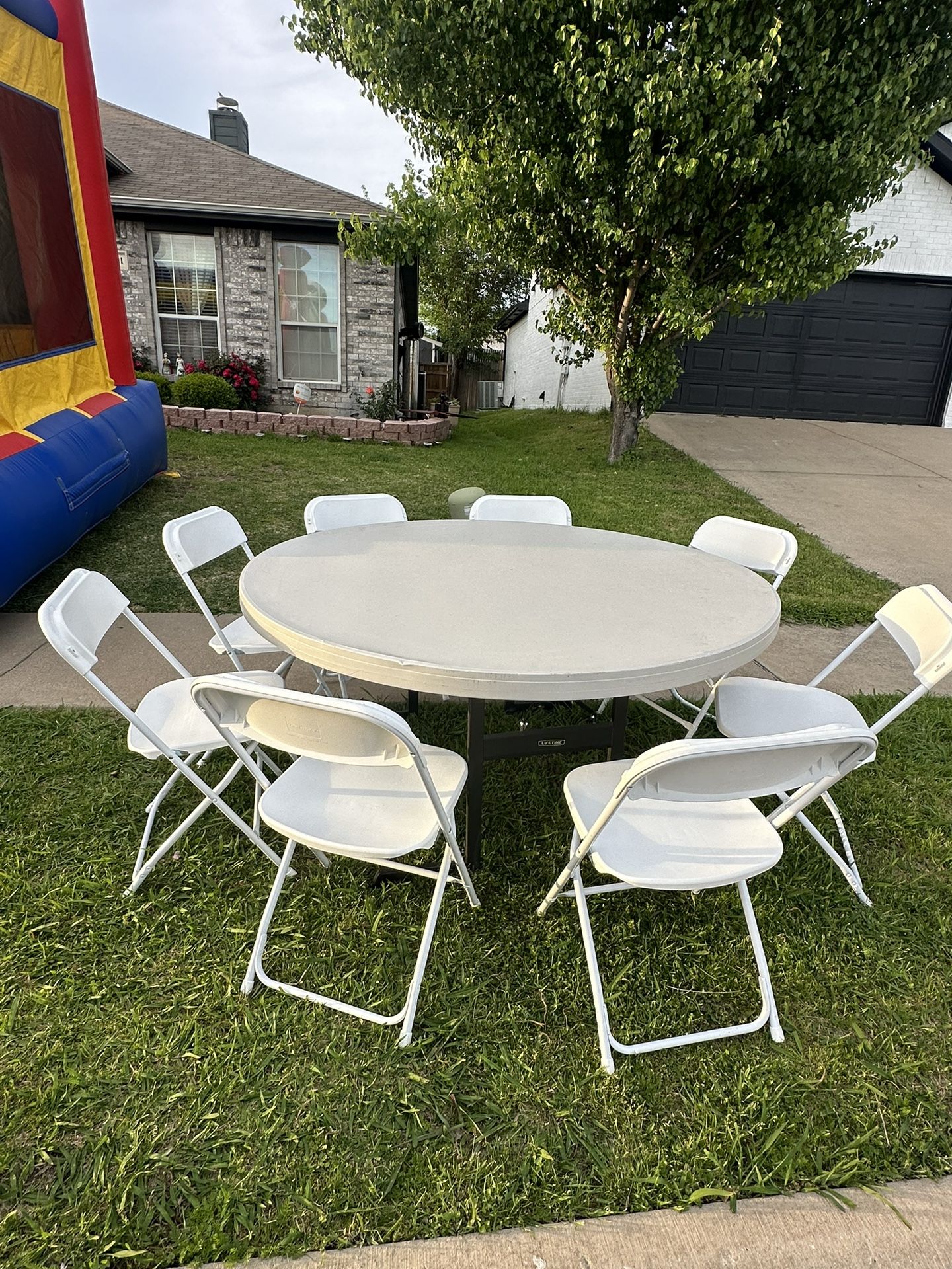 Mesas redondas, mesas rectangulares, sillas, carpas y trampolines