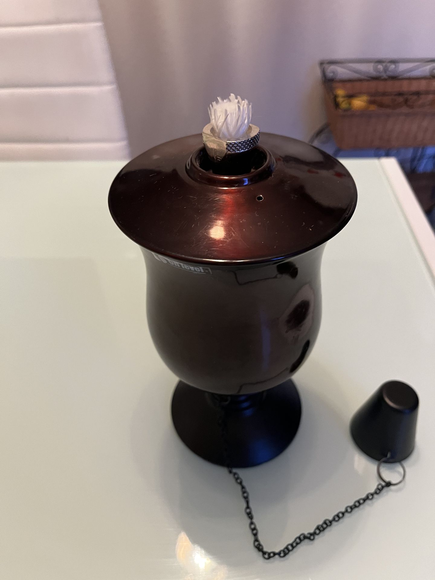 Brand new, oil lantern. Mauve in color, oil bronze feel.
