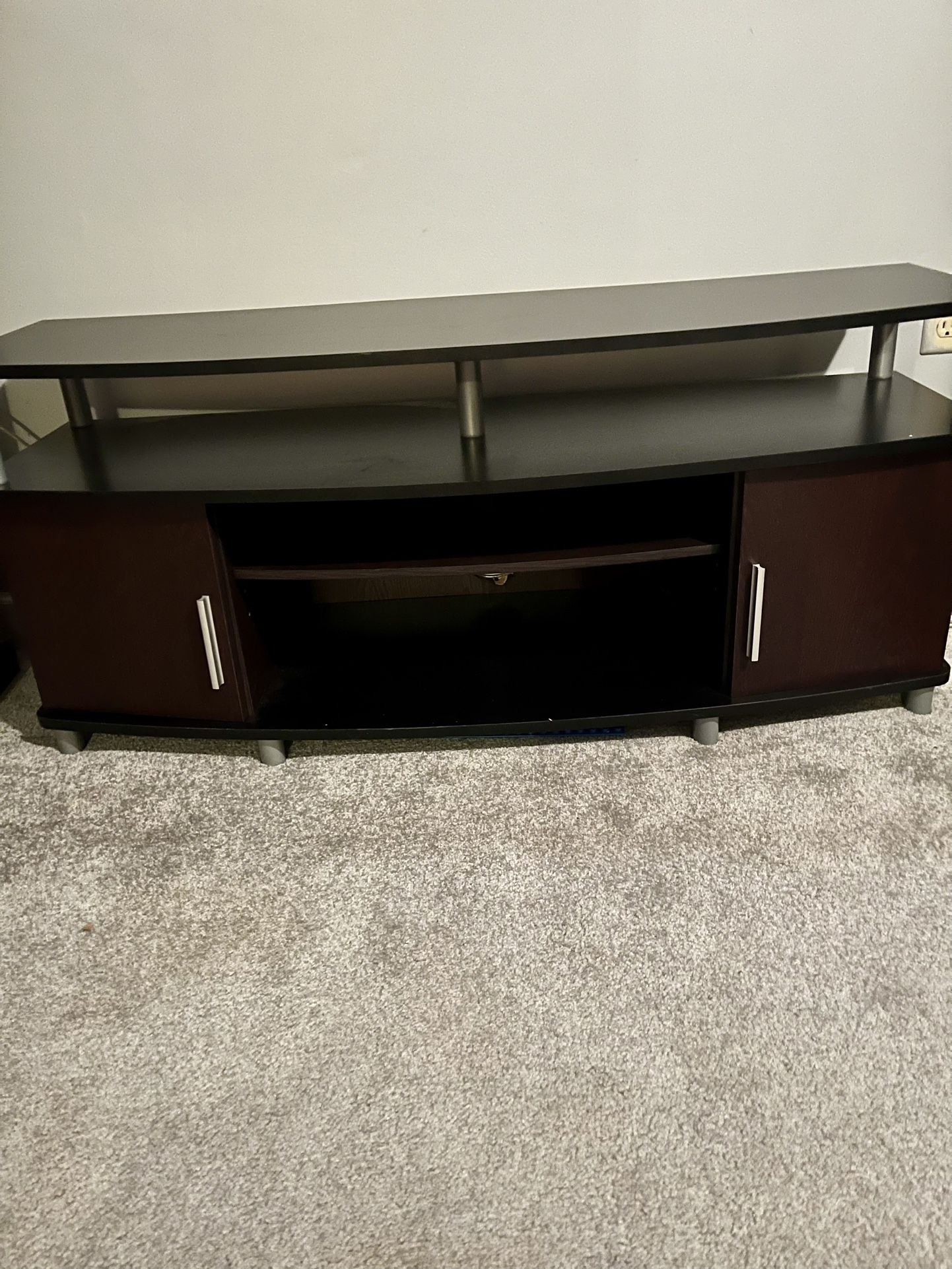Functional media console. Dark wood finish, reddish-brown cabinet doors. Silver legs and top shelf supports. Open shelf in the middle for electronics. Two cabinets on the sides for storage. Has a curved design. Great for your living room. Excellent condition 47.5”L x 20.5” height x 15” - 13” width. Pd 279.00. Moving. Must sell!!