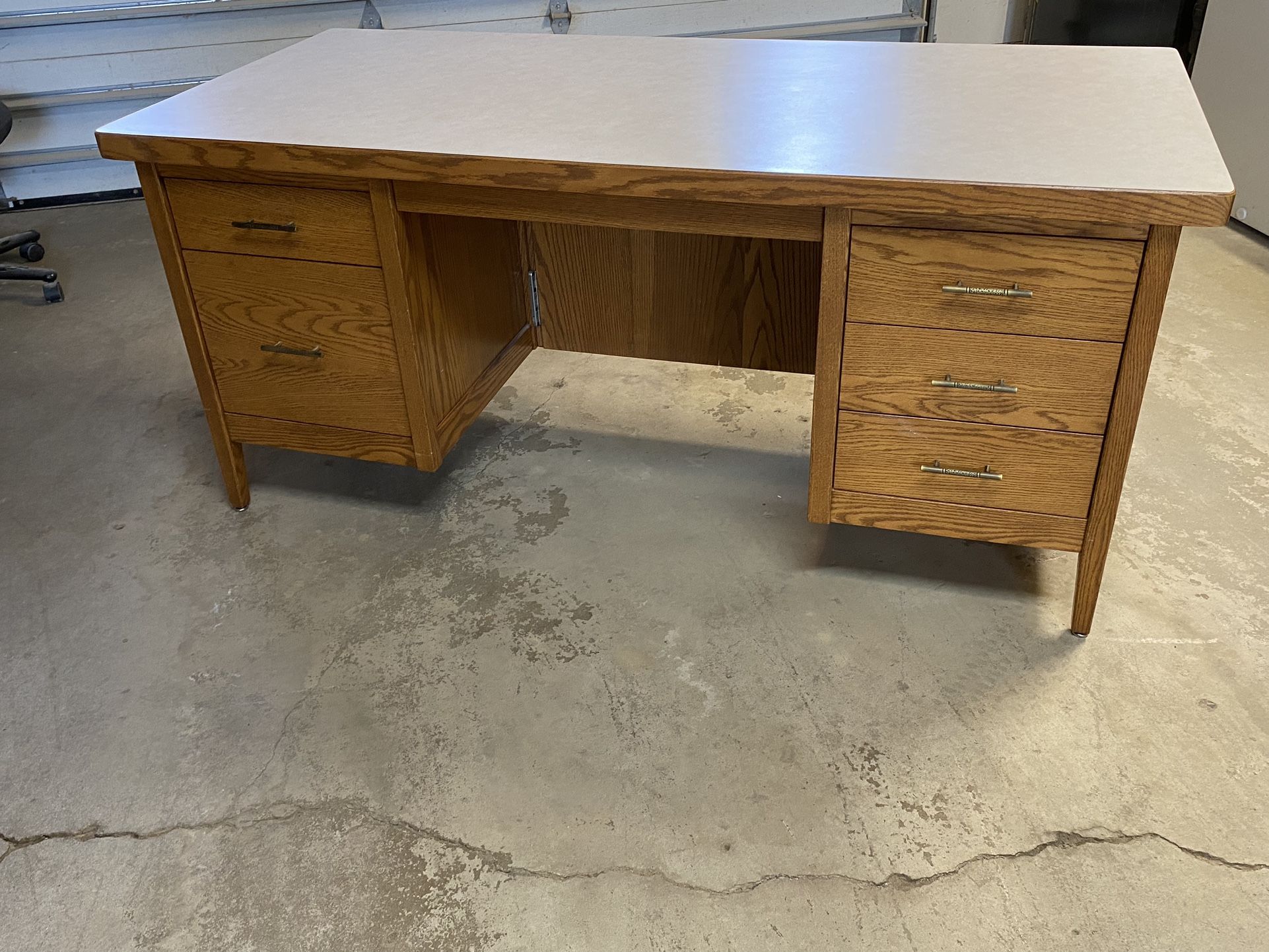Solid oak handcrafted desk. Desk itself measures 64” wide, 22” deep, 30” high. The top with the 9” overhang measures 32” deep, 68” wide. I’m a 40 year wood craftsman and made this desk about 25 years ago. This desk will literally last forever! Comes apart easily for transport. Retirement age now and looking for the next proud owner.