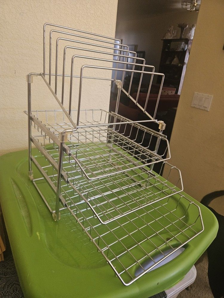 Versatile chrome wire organizer. Has multiple tiers for papers or files. Also has vertical slots, good for pot lids or cutting boards. Sturdy and clean.