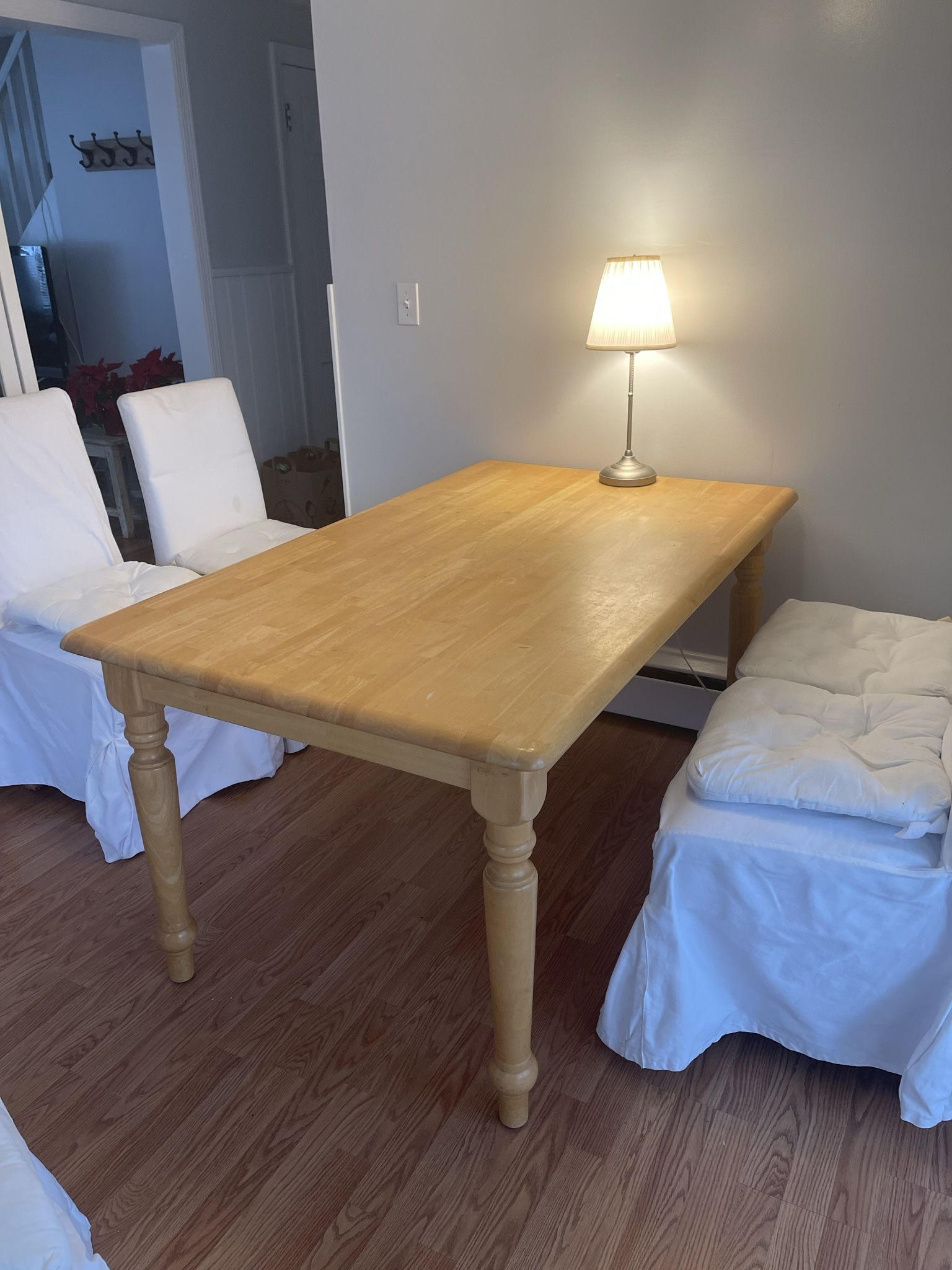 Pine table with 6 white IKEA cloth covered chairs ( slips washable)