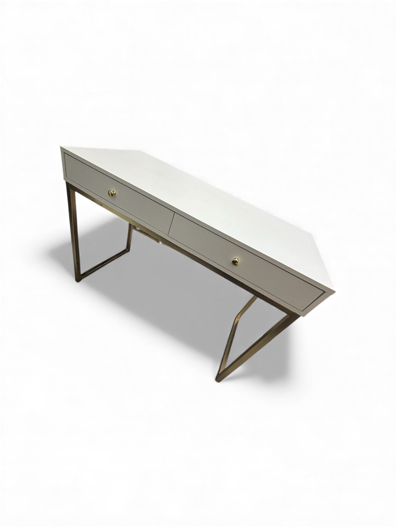 Modern white desk or console table with two drawers and gold-tone metal legs. Clean, sturdy, and in good used condition with light cosmetic wear from normal use. Works great as a desk, vanity, or entryway console. Drawers open and close smoothly. ✔ Two drawers ✔ Modern / contemporary style ✔ Used, not new ✔ Pickup only Cash, Zelle, or check accepted. Message if interested — priced to sell quickly. First come, First Served. I have 3 of these . Can either be purchased individually or in a set.