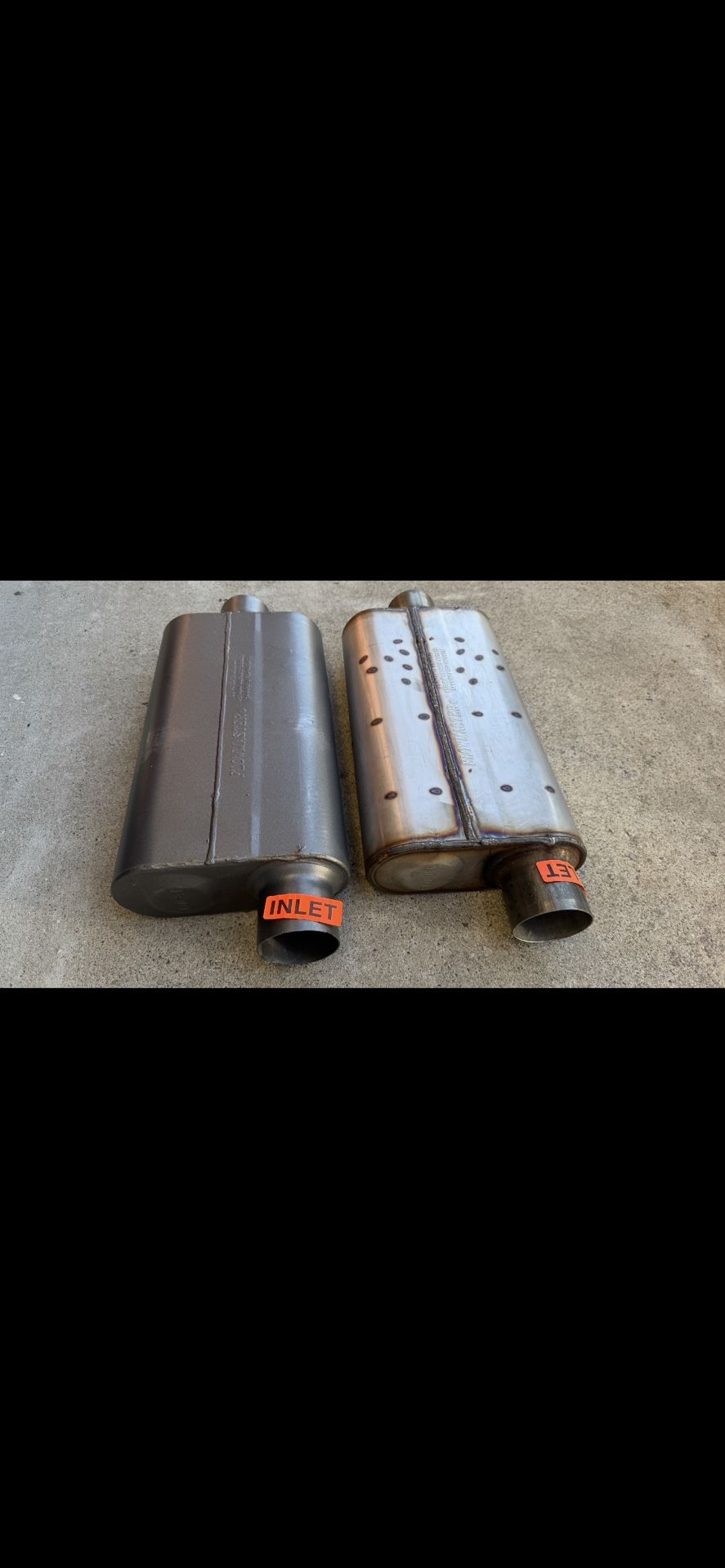 A PAIR of never installed Flowmaster mufflers. One appears to be painted dark gray and the other is bare. Neither one has ever been run on a vehicle. Part # 843051 This muffler retails for $188 each