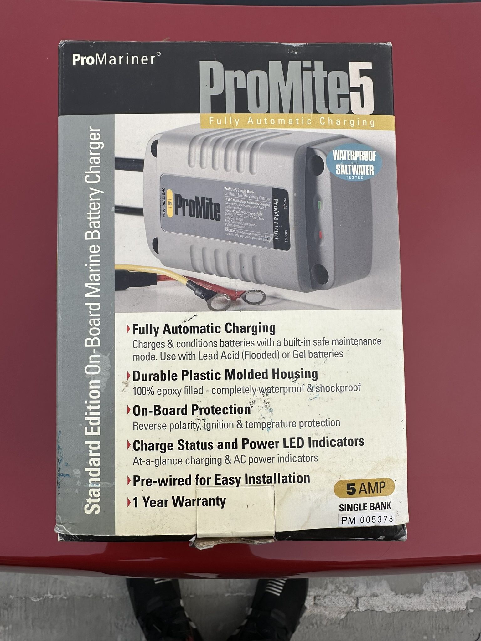 Designed to charge and maintain a boat battery • Commonly mounted inside boats, jet skis, or small marine setups • Works with 12V lead-acid or gel batteries • “5 amp single bank” = charges one battery at a moderate speed • Has automatic maintenance mode, so it can stay connected without overcharging