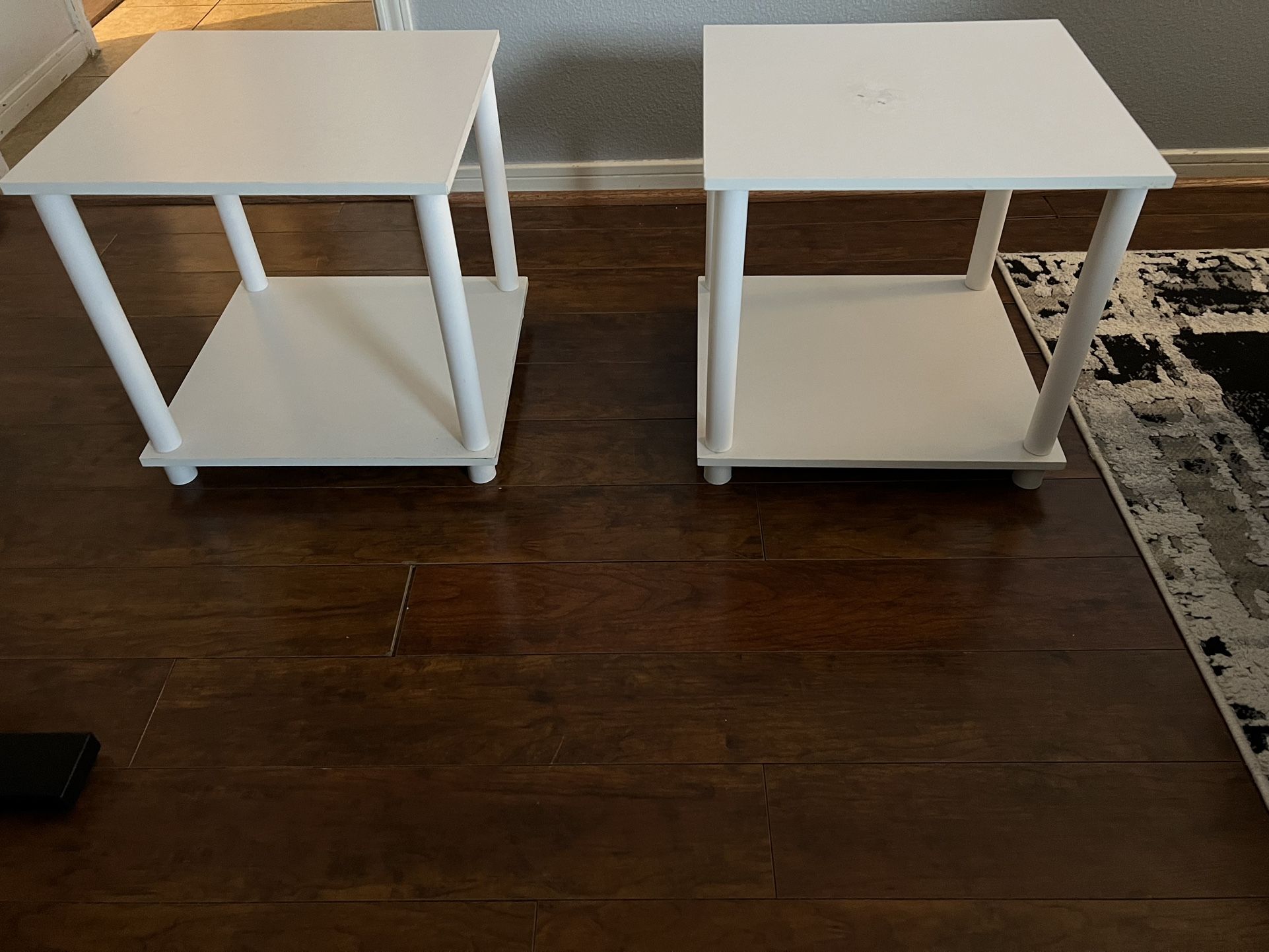 2 white side tables, one with blemish on top as seen in pictures. About 16 inches high from the floor, top of table is about 15.5 inches by 16.5 inches.
