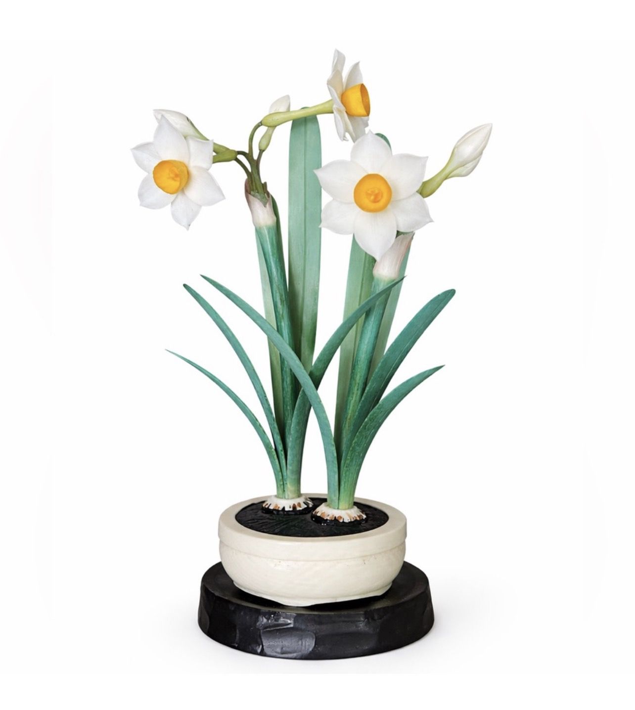 Antique Japanese Meiji Period Narcissus Okimono Botanical Sculpture c. 1800’s Museum-quality Japanese okimono from the Meiji period (1868–1912), finely carved as a narcissus (suisen) botanical, a flower long celebrated in Japanese decorative arts for its symbolism of purity, renewal, and quiet elegance. This piece comes from a private family lineage and belonged to my grandmother, who acquired it prior to my mother’s birth in 1943. It has remained in continuous family ownership for generations. The composition features multiple narcissus blooms rising from slender, upright stems, interspersed with elongated, blade-like leaves. Several blossoms are shown fully open, with delicately carved white petals surrounding raised central cups in warm golden tones, while adjacent buds suggest different stages of growth—an artistic device often used in high-quality Meiji botanical carvings to convey natural rhythm and life. The leaves are gracefully arched and finely textured, arranged in a balanced, upward composition that emphasizes vertical movement and refinement. The