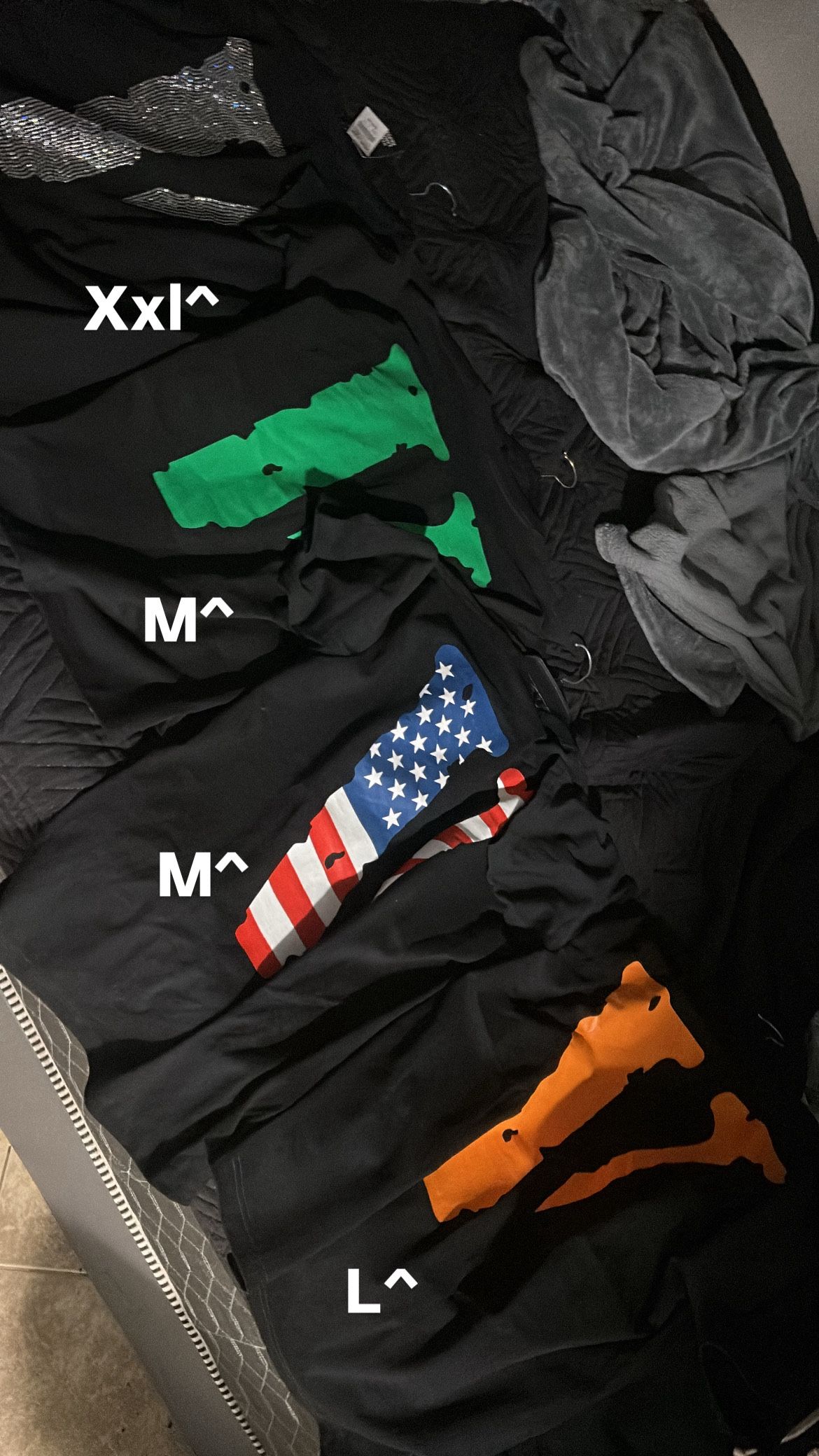Vlone ts different sizes Crystal vlone size xxl/35$ Green vlone size m/ 35$ American vlone size m/35$ Orange vlone size L/ 35$ All brand new with tags serious inquiries only, socorro area!got more deals on my page🙏🏼