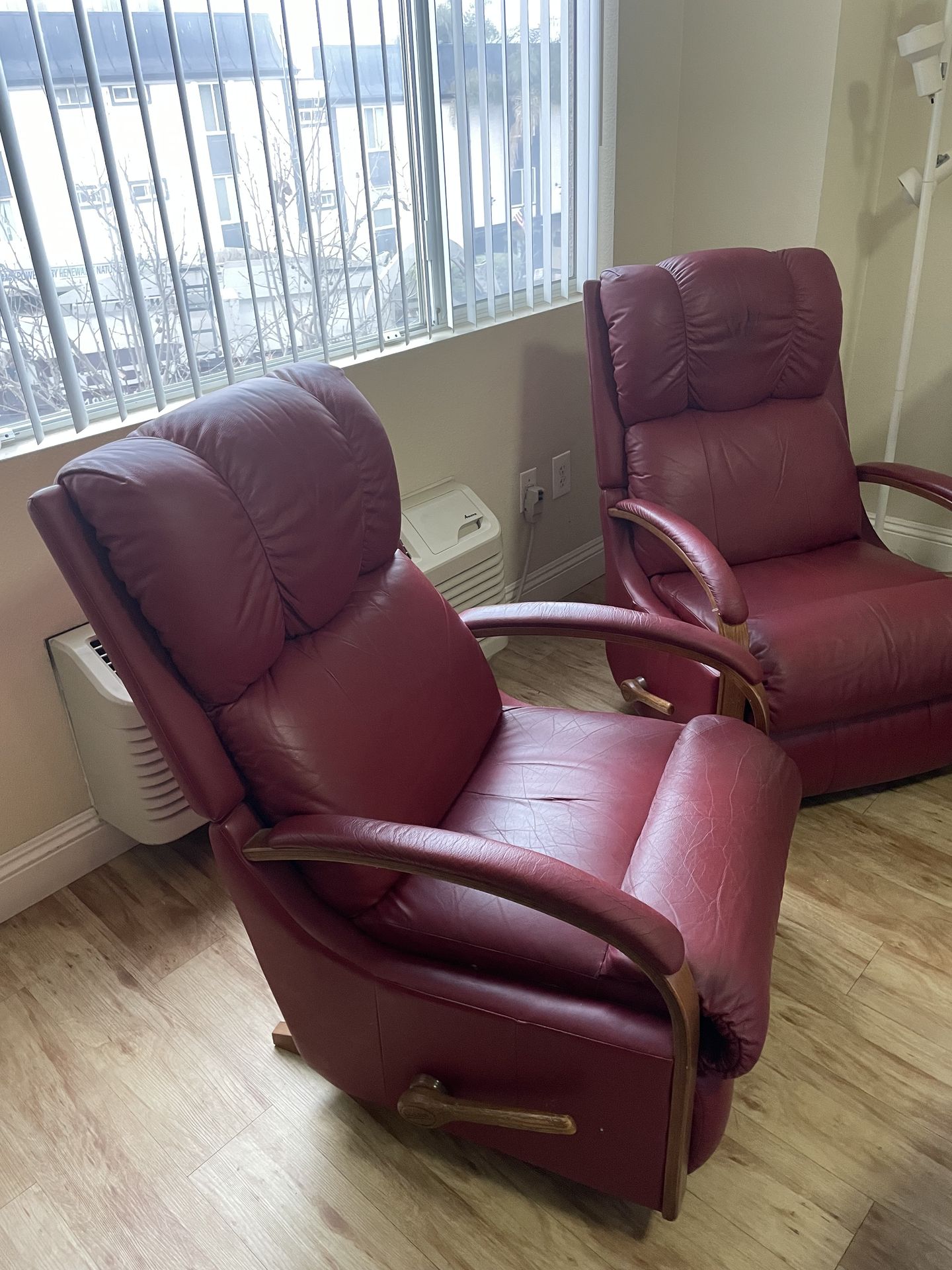 Two red leather recliners, no scratches, tears or holes. Very good condition. Both function great.