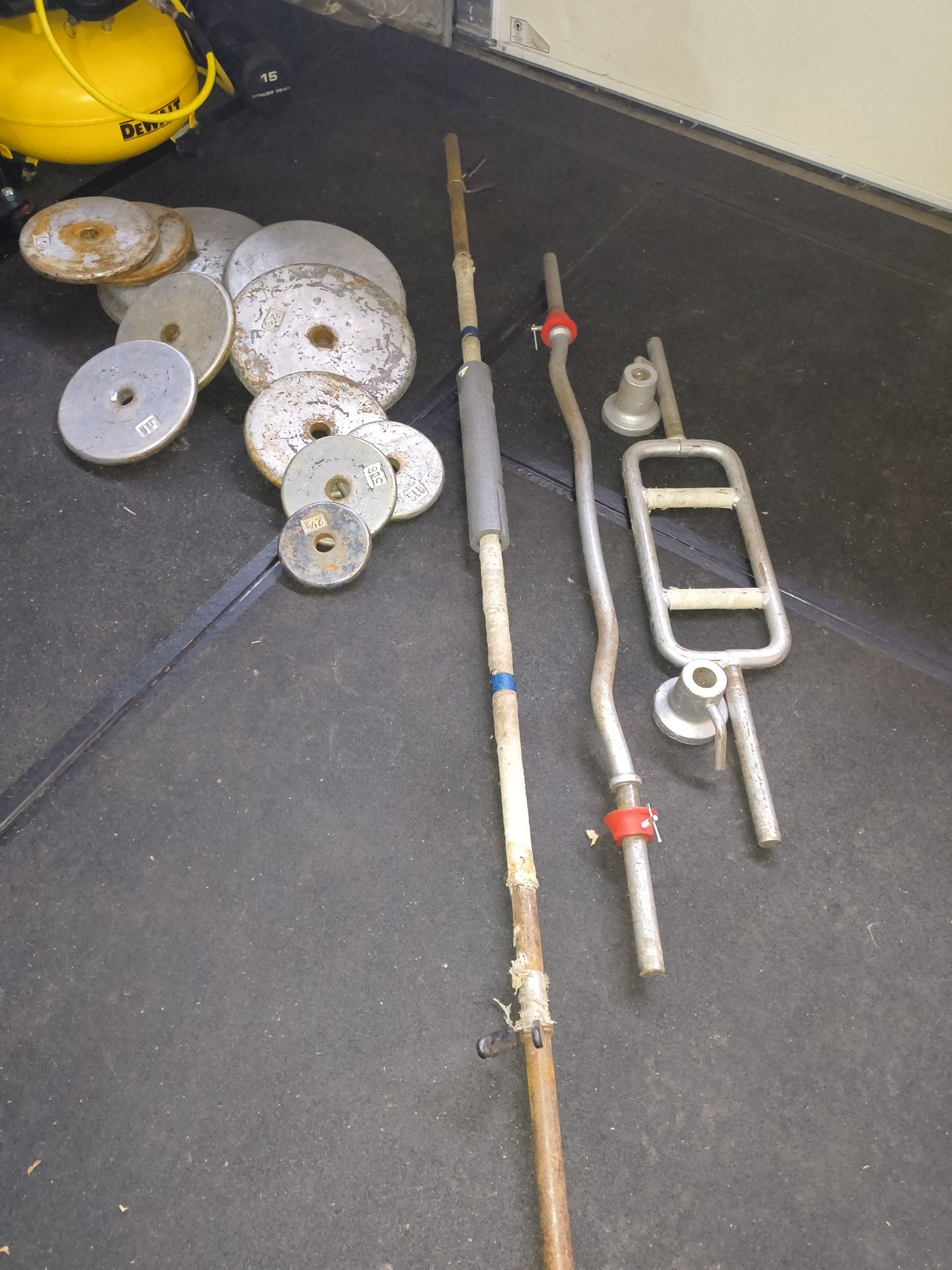 Three bars and 160lbs of standard weight plates $120 FIRM cash or zelle