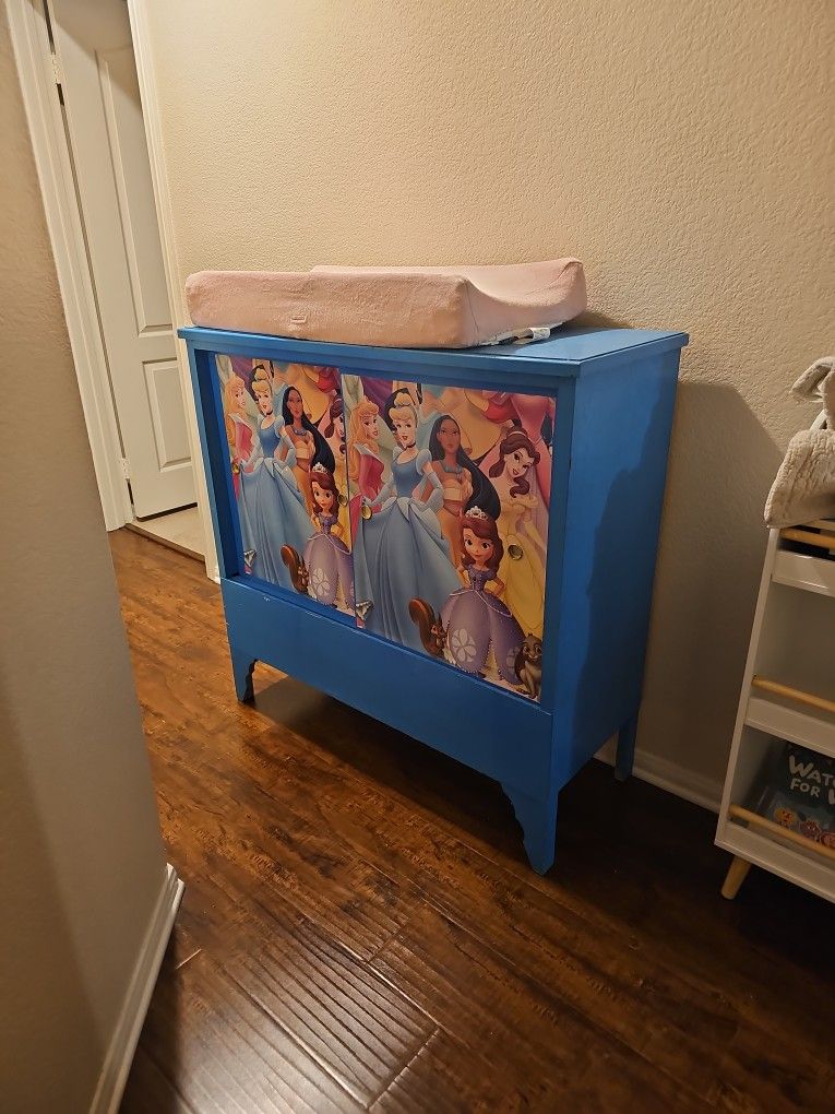 El ropero tiene su palo para colgar la ropa y del otro lado sus entrepaños para la ropa doblada. El colchón de cambio de pañales se le puede quitar. Small wardrobe for Baby or little girl. It has the area for hangers and shelves. The changing pad can be removed.