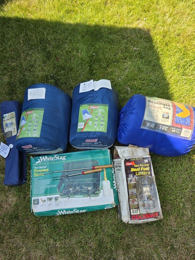 3 sleeping bags, a propane stove, oil lantern with 4 packs of new mantles and folding table. Selling all together. $60/OBO