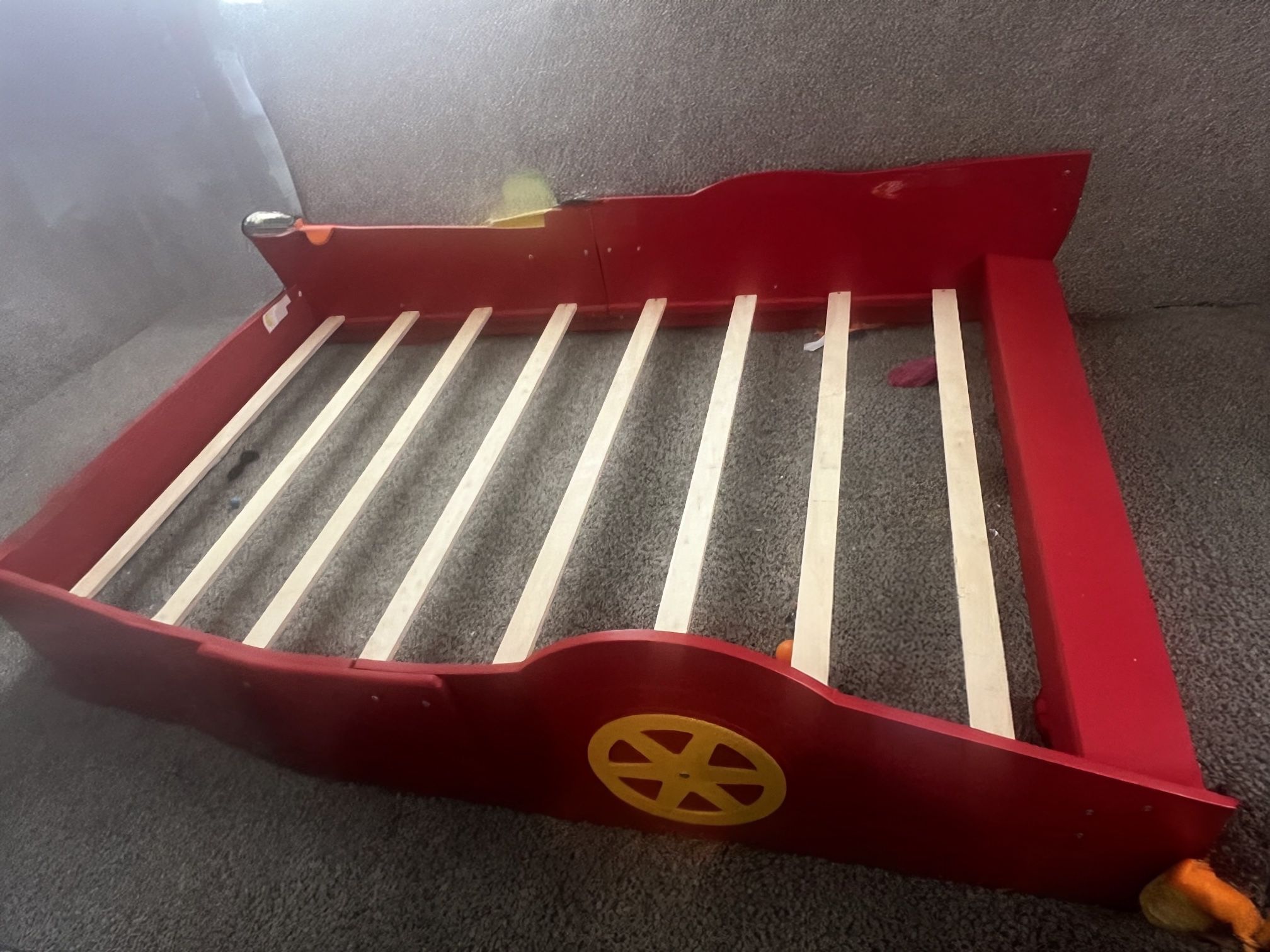 Used car platform bed frame Full size child bed frame Red car frame Need gone asap Selling for $90 -obo (Paid $149) Can meet you (local area) or pick up I’m adding an extra box frame that I paid separately for better stability and I’m including It with this platform bed frame. Weight and Dimensions: • Overall Product Dimension: 87.4"L x 55.3"W x 16.1"H • Number of Package: 1 • Overall Product Weight: 76.67lbs • Weight Capacity: 400LBS • Recommended Mattress Thickness: 6-8" Specifications: • Product Type: Race Car Bed • Size: Full • Color: Black/Red/Blue • Product material: Plywood+Pinewood+MDF • Bed slat material: Plywood • Level of Assembly: Full Assembly Needed • Screwdriver • Avoid power tools: Yes • Number of Slats: 8